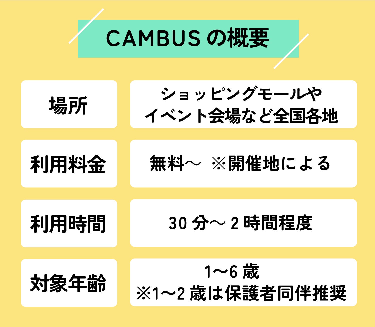 CAM+BUSでは30分から1時間程度、気軽にお子さまを預けていただけます。