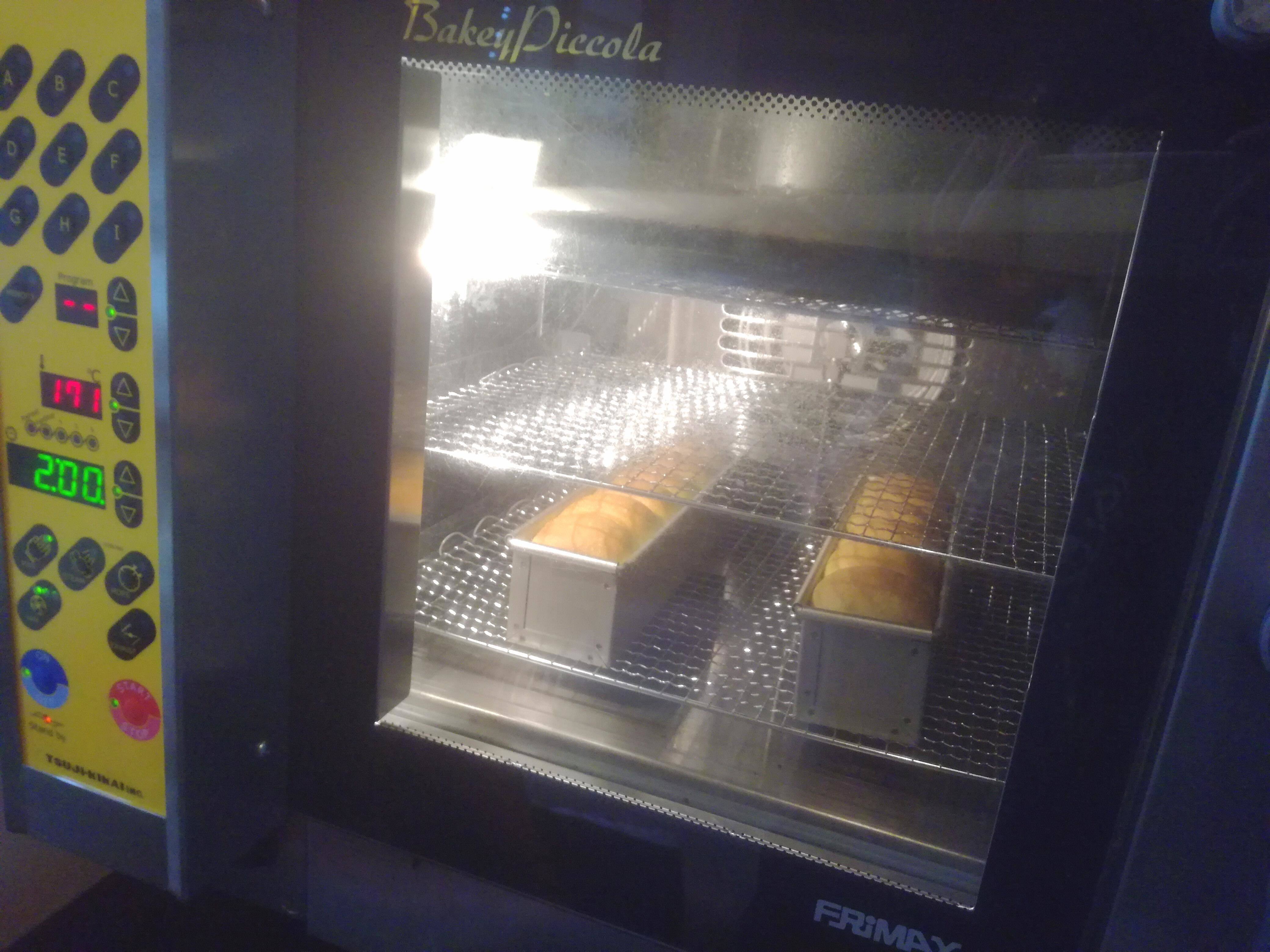 (中古で購入した小型の業務用オーブンでパンを焼く様子)