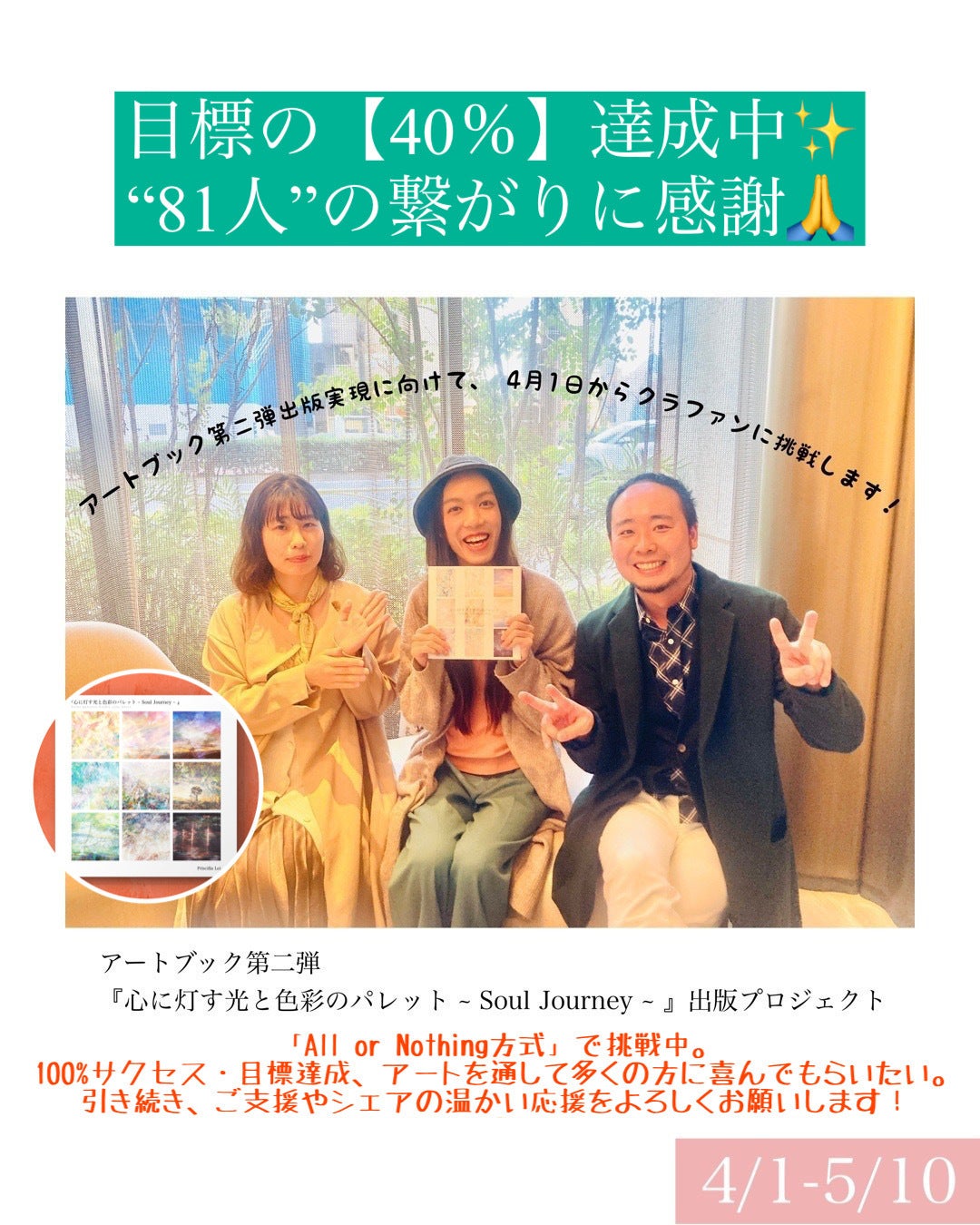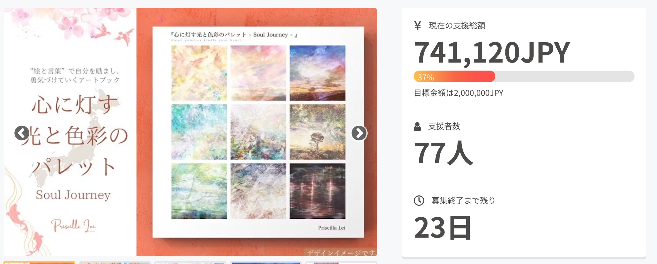 いつも心温まる応援を本当に本当にありがとうございます。。。!アーティスト Priscilla Lei (プリちゃん)ですこのクラファンも【残り14日】となりましたが、本日ご支援者さんがついに「100名」となりました。。!!!4月1日の初日早々から、今日に至るまで。こうして想いに共鳴してくださって、プロジェクト実現に向けた仲間になっていただいていることに、本当に感謝の気持ちでいっぱいです。。!ありがとうございます!目標達成率も、あと3%で「50%」になります。。。。!!!!これは、みんなの夢の実現がかなり近づいています!—–(2023年4月26日 21時現在)—–目標:200万円支援総額:942,394円(47%達成)支援者数:100人募集終了まで:14日———————————————全国・海外からも集った100人って凄いですよね。。??!!皆さんが率先してご支援していただいているからこそ、“100%サクセス”という結果をカタチにして、応援してくださる皆さんと喜び合いたい。。!思い描くことをみんなで叶えて現実のものとしたい気持ち、叶ったときの未来をワクワクする気持ち。その気持ちやハッピーエンドをイメージしてみると、ほんとうに残り14日間が楽しみで仕方がないんです。***“夢を描くことは大小問わず、明日を生きる楽しみになる。”そう強く感じているのは、私が無気力で生きる意味を見出せない時代もあったから。自分のことが嫌で、人間不信。心の奥底から感動することは程遠かった。辛いとか苦しいとかそういうのは飛び越えていて、涙腺が枯れ果てたのか?泣きたくても涙が流せない、一滴も流れない。目に映る世界は、深い霧のようなグレーがかった砂漠だった。そんな私が少しずつ変わりはじめて、鮮やかな色彩が増えてきたのは、これまでに出会ってきた、悩みながらも夢を叶えていく人の存在。そして、何度も自分のことを信じてみては、好きになっていく努力の積み重ね。すぐに叶えられるものって、ほんと少ない。けれど、夢や思い描いていることを叶えるためには、いつだって信じてみることからスタート。 それにね、毎日試行錯誤しながら色んな感情を味わえるプロセスって、ものすごく、、生きている実感がする。叶えるために明日も生きようって思える。私はそれが嬉しいの。まだまだこれから。***「残り14日」のチャレンジ。。。!あと2週間で全てが決まってしまいます。。!今回のプロジェクトは、【All or Nothing方式】。100%達成してはじめて、多くの方にアートブックを届けることができるようになります。最近もまた新しく追加リターンも増やしてみたのですが、100%達成に向けて”追加支援”をしてくださる方もいらっしゃって、、本当にありがたい気持ちでした。お礼のリターンは最初の頃よりも、数や種類が増えて充実しております。(リターン欄をあらためてチェックされてみてくださいね♪)ご支援がまだの方はぜひ、100%サクセス達成に向けて一緒に喜びあう仲間になっていただけると嬉しいです。。。!引き続き、Never give upの気持ちでベストを尽くし続けますので、みんなでこの出版プロジェクトを叶えましょうね!Priscilla LeiプリちゃんInstagram : @priscilla_lei_***☆★2023年クラファン支援者限定★☆◉リターンの説明にも記載しているのですが、、 “このプロジェクトにご支援してくださった全員のお名前”を、本と一緒に添えるシートに「クレジット記載」させていただきます。◉リターンはアートブック以外も沢山あります。。。!”また、お家やオフィスに飾ることのできるフォトアクリル作品・あなたを表すオーダーアートのリターンには、アートブック第二弾(サイン付き)もセットという、クラファンSpecialコースもご用意しています。(作品はそれぞれ先着1名様。今すでにSOLD OUTしたものもありますので、早い者勝ちですよ)✴︎⋆.* ✴︎⋆.* ✴︎⋆.* ✴︎⋆.* ✴︎⋆.* ✴︎⋆.* ✴︎⋆.* ✴︎⋆.*☆★想いを込めたプロジェクトページ★☆https://camp-fire.jp/projects/view/663941?utm_campaign=cp_po_share_c_msg_mypage_projects_show【ご支援の締切は、5月10日(水) 23:59までです。】