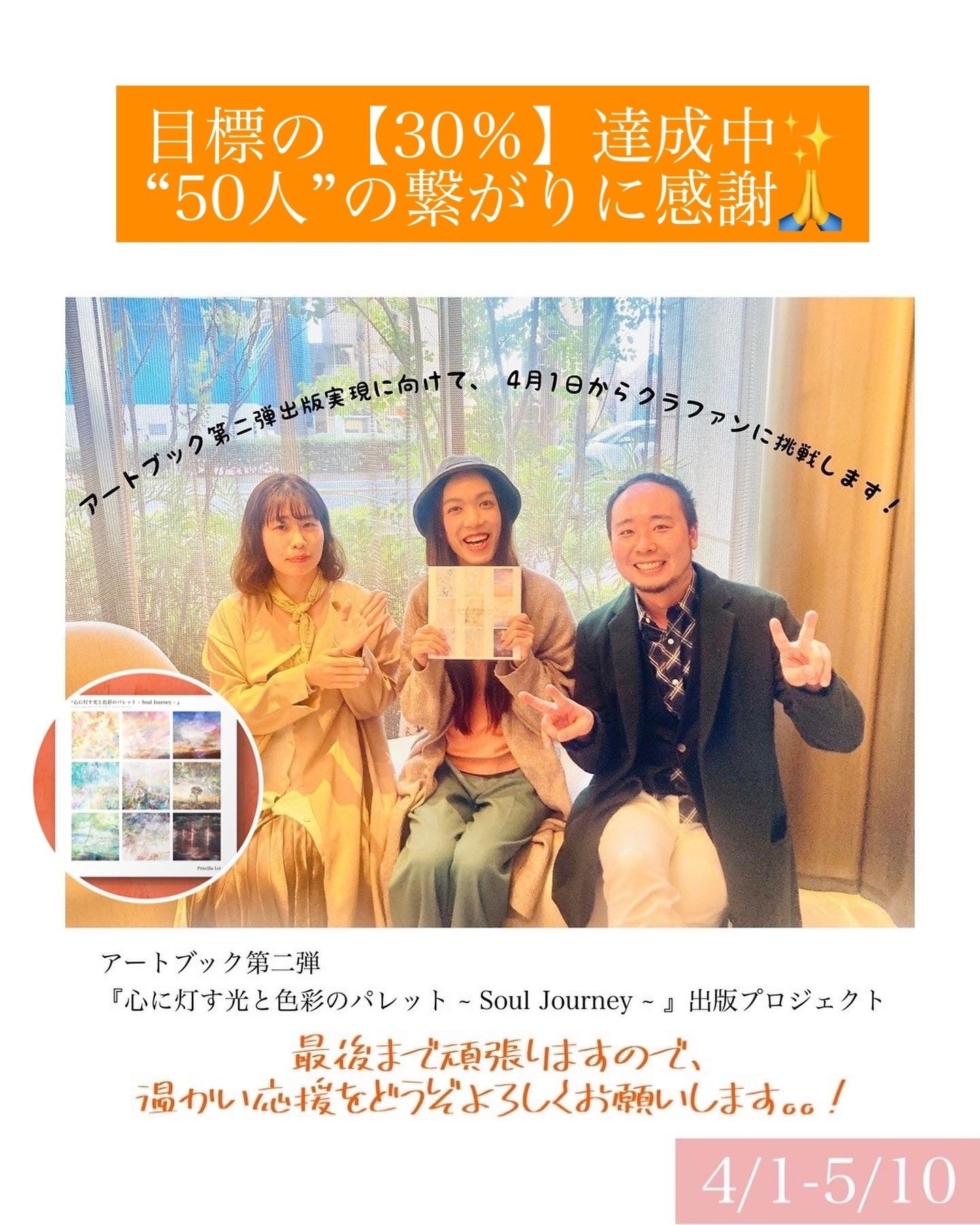 みなさん、こんにちは!アーティスト Priscilla Lei (プリちゃん)です。5月のはじまり。大変嬉しいことに、先日ついに【52%】まで到達しました!!これは本当に嬉しかった。。!100%サクセスまで、あと半分を切っています。。!「残り955,615円」で、みんなの夢である、アートブック第二弾・出版が叶い、みなさんに届けることができるようになります。。!(あと半分だよ〜!!)ここまで来れたのも、ご支援やシェアをしてくださる皆さんのおかげ様です。本当に本当にありがとうございます。。!残り955,615円—–(2023年5月2日 14時現在)—–目標:200万円支援総額:1,044,385円(52%達成)支援者数:114人募集終了まで:8日———————————————「プリちゃんは、夢を叶え続ける力が凄い」と、私に伝えてくださる方がいた。けれど、私の夢は決して一人で叶えているわけじゃないのね。これまでに叶えてきたことは全部、その夢に対して協力や応援をしてくださる方がいたから。もし、誰一人として応援してくださる存在がいなければ、私はきっと今のような、「楽ではないけども、心の奥底から満足している生き方」はできていないと確信する。個展開催も、アートブック出版も、日本一周も全部そう。だからこそ、現状に満足するのではなくて、常に向上していく姿勢をこれからも大切にして、応援してくださる方が「プリちゃんを応援できて良かった ! 」と、心から感じてもらえるような人へ成長していきたいなっていつも思うのね。それもあるから、思い描く夢を叶えるまでアクションを移し続けるし、「やっぱり私には無理かも・・」って、自分にある無限の可能性というドアを、やってもいないのに自分ですぐに諦めて閉ざしたくないの。***そんな私も、高校生になるまではずっと内気で、消極的。自分の意見や気持ちを親にさえ伝えることが難しかったし、夢や目標も漠然とした状態のときもあったよ。今よりも遥かに打たれ弱くて、落ち込みやすくて。ちょっとした相手の言動一つ一つから傷つきやすくて。。(いろんなことに対してキャッチしやすいのは今も変わらないのだけどね、、そのウィークポイントも強みに転換するようにしてるんよ。)特に、大学時代は将来のことが定まらないことに悩んで苦しんでいた期間が長すぎたから、ほんと辛かったなぁ〜。そんな私だったけれども、できるアクションは絶やさずに模索し続けて。そこから10年もの月日が流れて、やっと今なのね。それでも全然余裕じゃないし、思い描く夢を叶えるために毎日全力。最近気づいたのは、大変なことを経験させてもらうたびに、脱力するコツや沈んだときの立ち直り方を学ばさせてもらっては、少しずつ軽やかさも身についてきたこと。これは思いがけない収穫で嬉しかった♪***私が人生を注いでいる大好きな創作活動が、万人じゃなくても心から喜んでいただける方が一人でもいて、今日も待ち望んでいること。そうなると、夢を叶えていくためのパワーが内側からブワッと溢れて出てくるよね。。!ほんと、ありがたいよね。今回のプロジェクトは、【All or Nothing方式】。最終日である5/10(水)までに100%を達成できなければ、みんなの夢であるアートブック第二弾を届けることは叶えることができなくなってしまうのです。。。ご縁のある皆で大きな夢を叶えていくチャレンジも、「残り8日」。今すでにご支援していただいている方や、100%サクセス達成後に縁していく多くの人に、アートを通して喜んでいただきたい。笑顔の輪をひろげていきたい。そのためにも、まだご支援されていない方は、ぜひ仲間になっていただけると心強く思います。。!!お礼のリターンは本以外にも、ポストカードといったグッズ、撮影体験、葉山 or 京都のリトリート体験、PhotoArt Workshop、オーダーアートetc。いろんな種類をご用意しています。引き続き、私も最後の最後までアクションに移しながら、Never give upでがんばりますので、どうぞご支援やシェアをよろしくお願いします。。!一人一人が最高のGWを過ごせますように。Priscilla Leiプリちゃん✴︎⋆.* ✴︎⋆.* ✴︎⋆.* ✴︎⋆.* ✴︎⋆.* ✴︎⋆.* ✴︎⋆.* ✴︎⋆.*アートブック第二弾・出版実現プロジェクト「“夢は叶えるもの” 自分を励まし勇気づけるアートブックを日本・海外に届けたい!」<想いを込めたプロジェクトページ>https://camp-fire.jp/projects/view/663941?utm_campaign=cp_po_share_c_msg_mypage_projects_show【ご支援の締切は、5月10日(水) 23:59までです。】