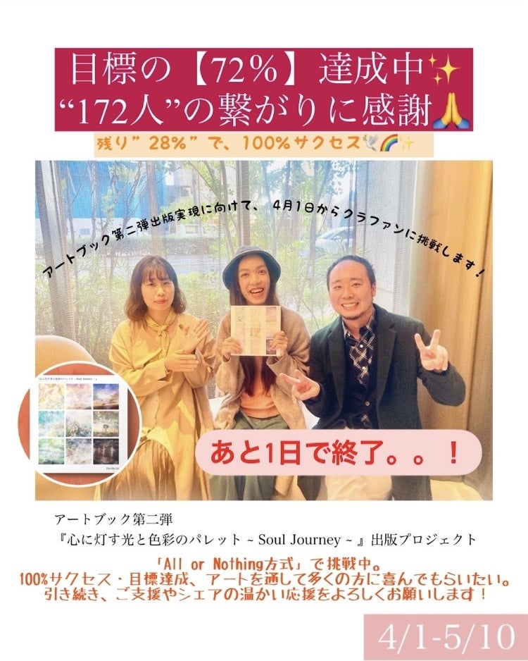 こんにちは!アーティスト Priscilla Lei(プリちゃん)です。GWいかがお過ごしでしたか??私はクラファンの呼びかけや、いとこの結婚式の撮影、そして大阪個展の準備と、仕事オンリーの充実した時間を過ごさせていただいて、感謝の毎日。応援してくださる皆さんのお陰様で、なんと【72%】まで到達することができました。。。!!!ご支援者さんは170人を超えて、このタイミングで仲間になってくださることに本当に感謝の気持ちでいっぱいです。。!想いに共鳴して集ってくださった皆さんのおかげで、 あと「28%」の応援パワー、"残り540,323円"が集まれば、みんなの夢である100%サクセスに達成できるところまできました。。!今すでにご支援やシェアをしていただいた皆さん、本当に本当にありがとうございます。。ゴールは本当に目の前です。私たちなら、100%サクセス達成できる。。!最後の最後まで信じる。残り540,323円で、100%サクセス!—–(2023年5月9日 14時現在)—–目標:200万円支援総額:1,459,677円(72%達成)支援者数:174人募集終了まで:1日———————————————ご存知の方も多いように、このプロジェクトは【ALL or Nothing】。出版実現 or 募集期間までに目標金額に対して一円でも足りなければ、”全額ご返金”という覚悟がいるチャレンジ。なので、100%を達成しないとダメなんです。今すでに沢山の方々から応援していただいているので、その方々のためにも、絶対に叶えたい。届けたい。そして、今繋がっている方と一緒に喜びあいたい。アートブック第二弾が2023年9月に完成し、今のクラファンのことを知らずに手にする人たちにも、「実は2023年4月からGW明けにかけて、みんなで応援しあって産まれた、想いが沢山詰まったアートブックなんだよ〜。大きな夢は一人では叶えることは難しいかも知れないけれど、みんなで力を合わせれば、叶えることもできるんだよ〜。」って、創作背景・ストーリーもシェアしていきたい。***私は2022年に、学生時代(約10年前)の夢の一つでもあった日本一周を実践し、旅先で出会う人や、SNSなどオンラインで繋がりのある皆さんに支えられて達成。思い描く夢や目標が、今すぐには叶えられなかったとしても、叶えられるまで温め続けることで、一番適したタイミングで叶えることができる。自分で自分の可能性を諦めずに、信じ続けてみること。叶えるためのアクションを、叶えるまで積み重ねていくこと。そのことを、またとない日本一周の体験を通して、一番学ばさせていただきました。“どこまでも周りではなく、自分次第で状況も環境も変えていくことができる。”と。***夢や目標・ビジョンを掲げたときは高揚感でいっぱいになっても、叶えていくプロセスにおいては悩んだり・苦しんでしまうことも心のなかで芽生えてくる。。それは思い描くゴールに対して真剣に自分と向き合っている証だし、本気だからだと思うのね。そんなときに、「絵と言葉で、自分を励まし・勇気づけていく一冊があったら。。」“どれだけ大変な状況であっても、すぐに諦めずに工夫や可能性を見出していけるのではないか。。?””困難が降り注いでも、希望を信じて再びゴールに向かって歩んでいけるのではないか。。?”と。本であれば、一人で過ごしたいときでも自分のペースでアートに触れながらご自愛できる。私もこれまでの人生において、先人たちが綴ってきた沢山の本に心救われてきたからこそ、今度は贈る側として、実体験をもとに創作したアートや、紡いだメッセージを収録した一冊を創って届けたい。そして、アートブックに縁するひとりひとりが、最高の形で叶えて欲しい。。。!すぐに夢や目標を諦めないでほしい。。 “Never giver up (=自分で自分の可能性を諦めないで)”。 この一番伝えたいメッセージを多くの方に届けるためにも、アートブック第二弾『心に灯す光と色彩のパレット ~ Soul Journey~ 』の出版実現に向けたクラファンに挑戦しています。***あと1日。ご支援を迷われている方でしたら、ぜひこのタイミングで応援してほしいです。。!このプロジェクトページに綴っている、みんなの夢を叶えるためには、あなたの力がとっても必要です。 私のためではなくて、このプロジェクトが100%サクセスすることで沢山の方々がアートを通して笑顔になったり、リラックスできたり、元気になったり、幸せになれる一つのきっかけを贈っていくために、温かい応援をどうぞよろしくお願いします。私も最後の最後まで、Never give up で取り組みますね。***アートブック以外にも沢山のリターンがありますので、ぜひ今一度プロジェクトページをご覧いただけると嬉しいです。☆★“夢は叶えるもの” 自分を励まし勇気づけるアートブックを日本・海外に届けたい!★☆(あと28%集まれば、100%サクセス) ◉プリちゃん、このプロジェクトを応援したい方は、こちら◉https://camp-fire.jp/projects/view/663941 【ご支援の締切は、5月10日(水) 23:59までです。】Priscilla Leiプリちゃん