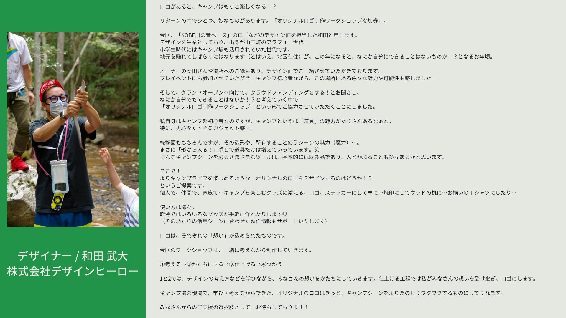 ※リターンは何もいらないけれども、神戸市北区山田町のKOBE川の音ベースのプロジェクトにご賛同ご支援いただける方は、こちらでのご支援をお願い申し上げます。キャンプ場オーナーの安田より、キャンプ場の写真を添えて、御礼のメッセージをお送りさせていただきます。