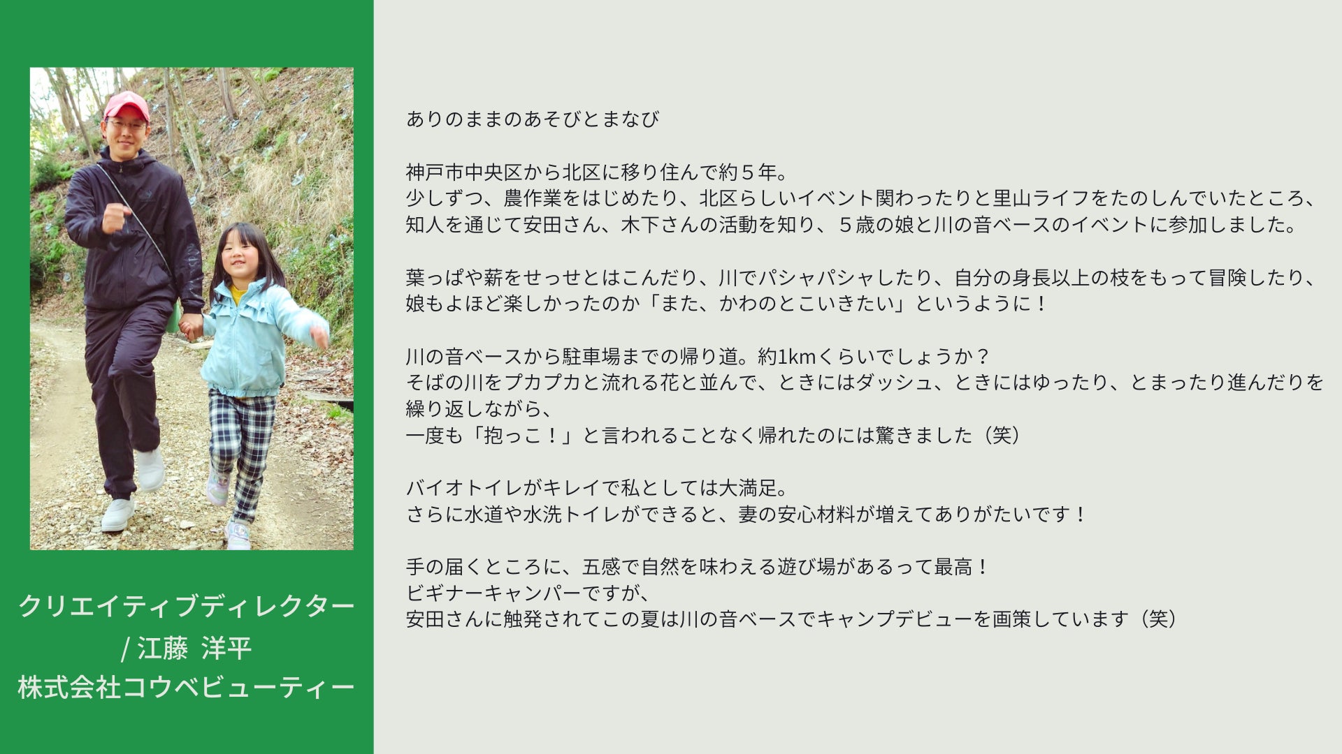 2023年3月吉日 KOBE川の音ベース キャンプ場 オーナー 安田のりみつ