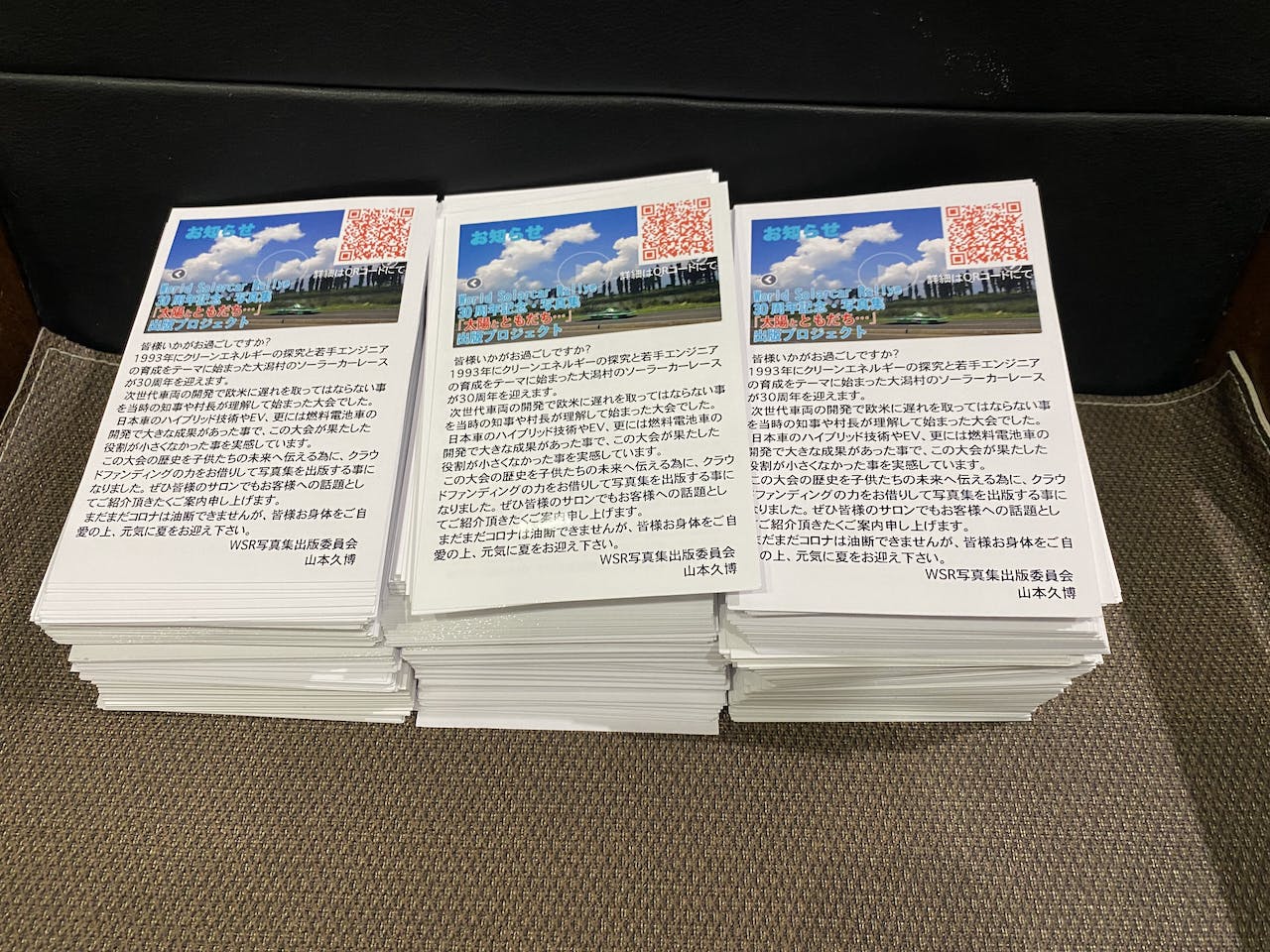 まだ二日目ですが多くの方達からのご支援をいただき感謝しております。最初のアクションは公開されたページのQRコードをプリントしたDMハガキを760枚、県内の知り合いのみんなに投函しました。深夜になってしまい、郵便局の前のポストは満腹状態・・・、回収の担当の方はビックリされたかもしれませんね。次は店内に貼るチラシと配布用カードを作成してモードスタジオQで大々的に情報発信に努めます。