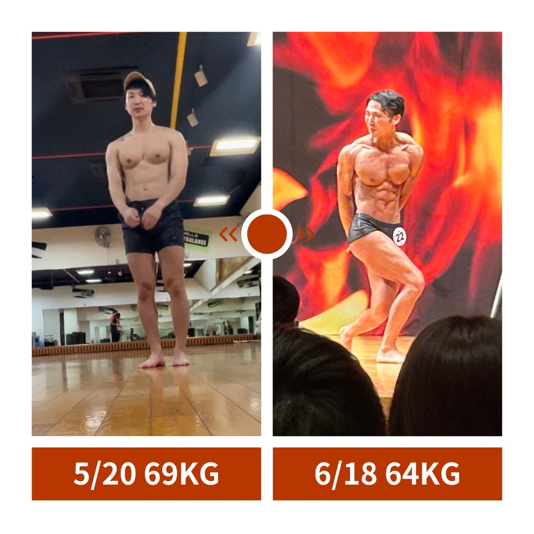 しかし、出場を決めた5/20 69kgの状態から、大会当日の6/18には64kgと-5kgの減量に成功しました…!
