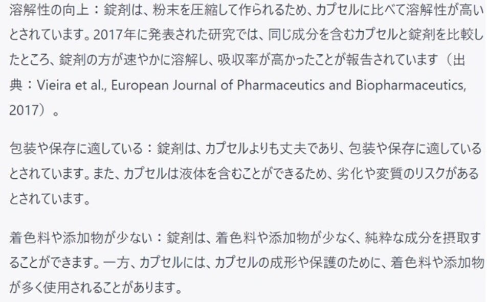 以上の研究からは、錠剤がカプセルよりも溶解性が高く、包装や保存に適していることや着色料や添加物が少ないこと、一定量の取りやすさがあることが示唆されています。