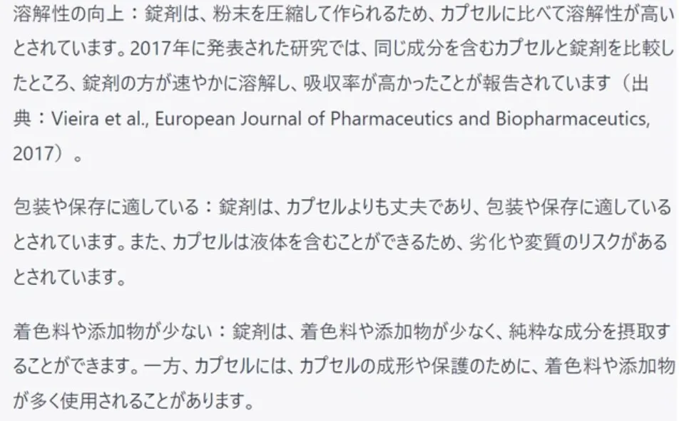 これらの研究からは、一般的に錠剤に含まれる添加物がカプセルに比べて少ないことが示されています。