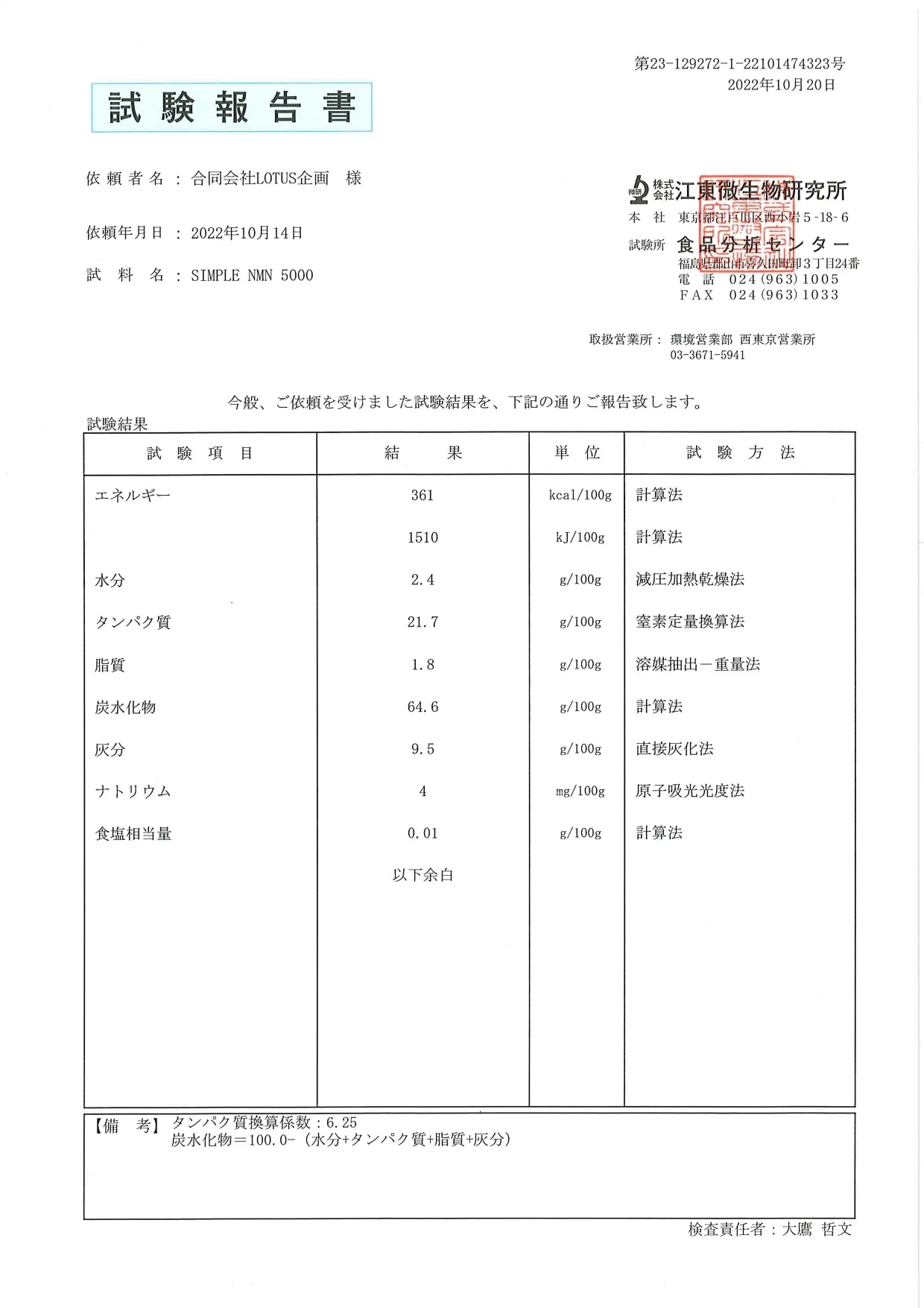 もちろん品質や成分について一切の妥協はありません。NMNを錠剤として整形した成分検査の結果です。以下の検査結果は直接圧縮法で打錠したNMNサプリメントの品質が低下していない証明です。