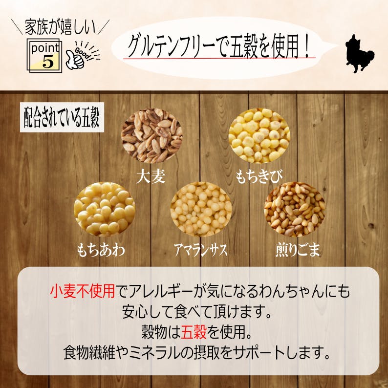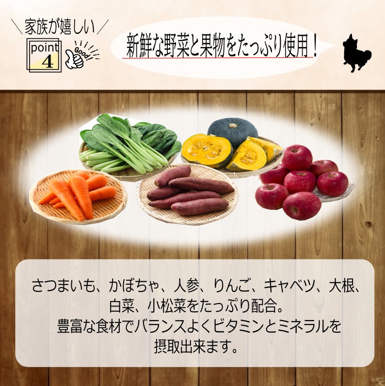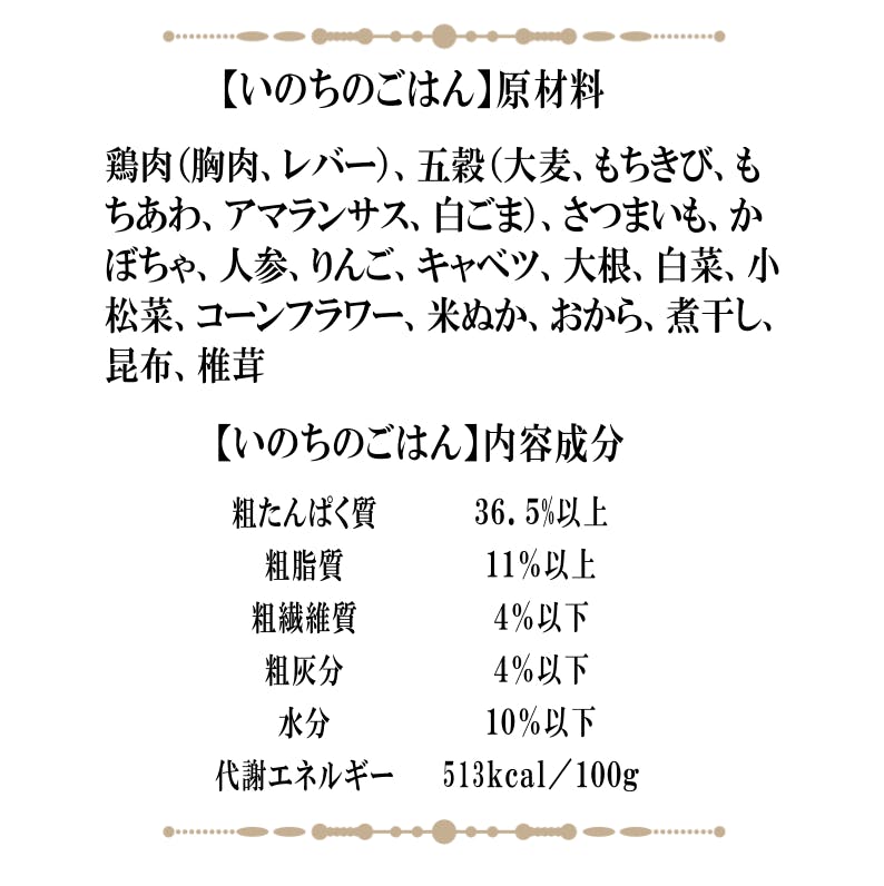原材料:鶏肉(胸肉、レバー)、五穀(大麦、もちきび、もちあわ、アマランサス、白ごま)、さつまいも、かぼちゃ、人参、りんご、キャベツ、大根、白菜、小松菜、コーンフラワー、米ぬか、おから、煮干し、昆布、椎茸、鰹節