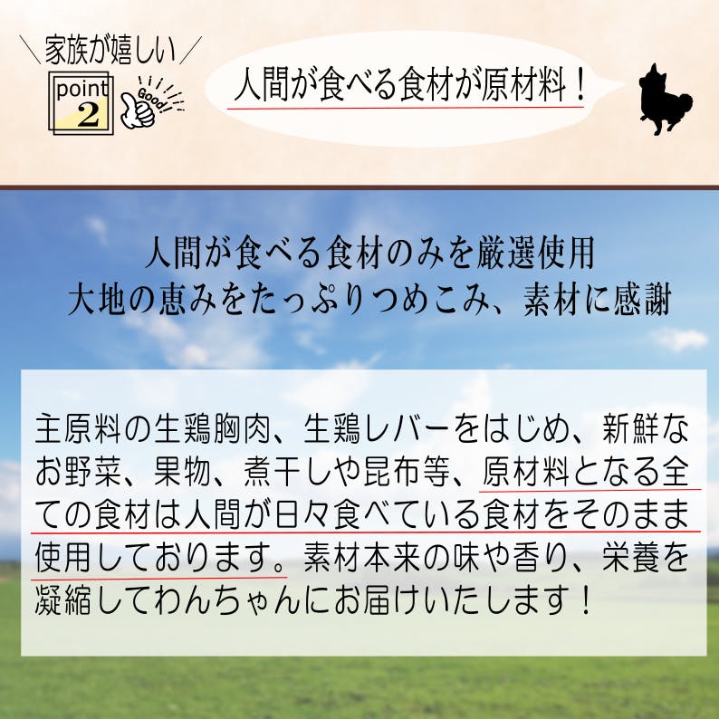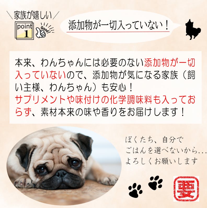 「1日でも長く、1つでも多くの想い出を」をコンセプトに 、わたくしどもで製造、販売しております「いのちのごはん」は添加物を一切含まず、人間が食べる食材のみを原材料に使用した国産無添加ドッグフードです。