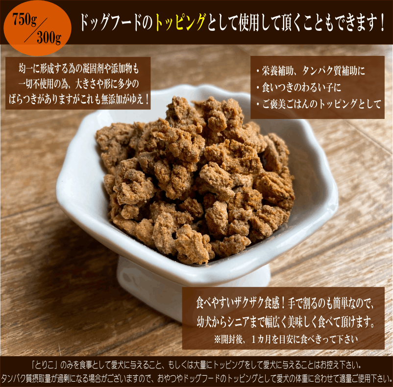 リターにご用意したのは、ご紹介した「いのちのごはん」と、同じく添加物が一切入っていない無添加のわんこのおやつ「とりこ」です。とりこの原材料は、生鶏胸肉と生鶏レバーのみ。ごはんのトッピングにもご利用いただけます。