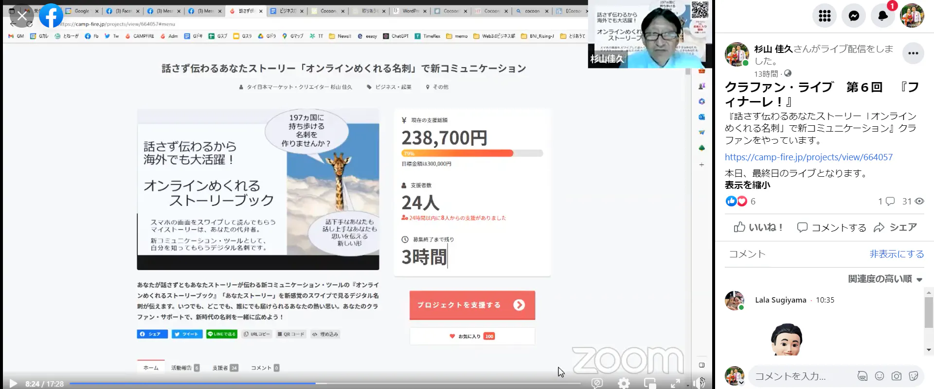 2023/04/01 10:22クラファン・ライブ 第6回 『フィナーレ』あっという間の最終日のクラファン・ライブ。今回のクラファンの取組みについて、振り返りも含めてお話させてもらっています。https://www.facebook.com/1470203860/videos/750955353080705/7日間だけのクラファンという異例の短さではありましたが、この時点(3時間前)で、お気に入りの「100名」が達成していたので、ひとつの達成感がありました。諸処、改善すべき点はあり、次回のクラファンプロジェクトの立ち上げや、毎週火曜日にやっているクラファン部の活動に活かしていければと思っています。『オンラインめくれるストーリーブック』は、自分の伝えたいストーリーを物語の紙芝居をつくり、それをオンラインでめくれるように仕立てた製品です。それぞれの人には、それぞれのストーリーがあり、それは人を惹きつけるものだと思います。 もっと見る
