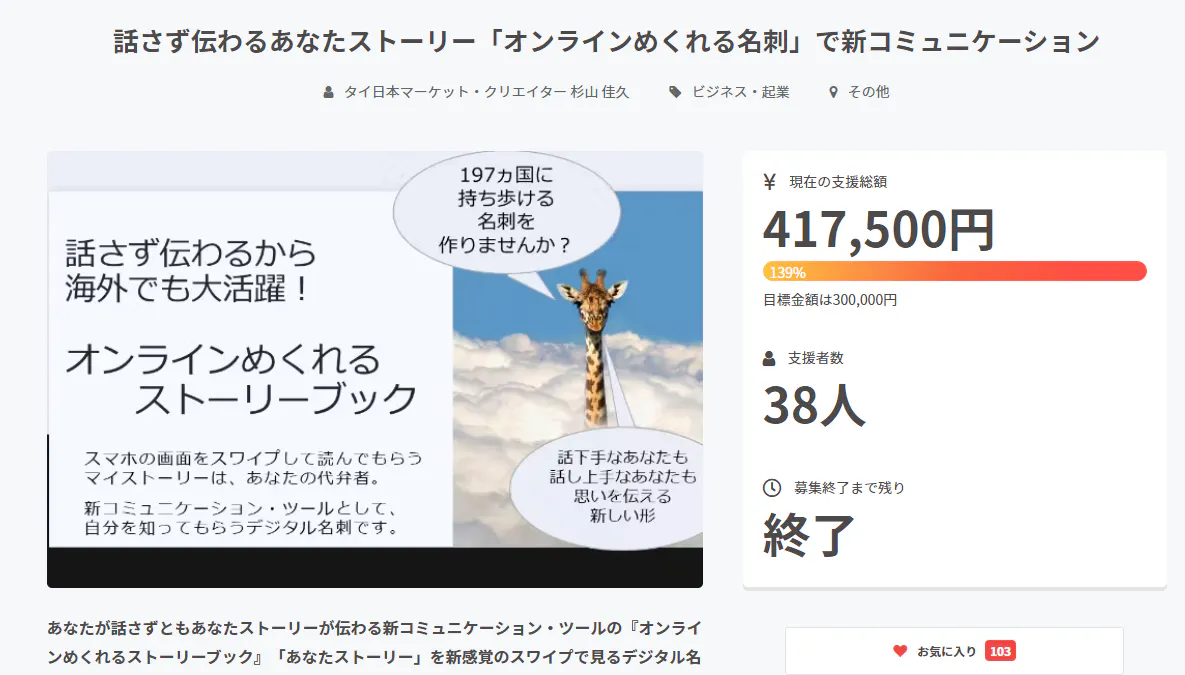 2023/04/01 10:25【活動報告】クラファン・ライブ おまけ 『サクセス・フィニッシュできました。ありがとうございます』<<<クラファン終了報告>>>3月31日23:59を持って、『話さず伝わるあなたストーリー「オンラインめくれる名刺」で新コミュニケーション』のクラファンが終了しました。おかげさまで、目標金額を超えるご支援を賜り、サクセスして終了することができました。ありがとうございます。>ご支援金額:417,500円>目標達成率:139%>お気に入り数:103人「このプロジェクトは、2023-03-25に募集を開始し、38人の支援により417,500円の資金を集め、2023-03-31に募集を終了しました」とページにもありますように、7日間のクラファンでした。クラファンキュレーターの飯島さんによると、>準備:2ヵ月>募集期間:30~60日>スタートダッシュ:1週間>最後の追い込み:1~2週間が通常のクラファンだということです。はじめと終わりの1週間を盛り上げることが、クラファンのサクセスのキーだということでした。今回は、その両方を1週間に詰めたクラファンになりました。皆さまのご支援とご協力、本当に感謝致します。ありがとうございました。リターン品については、4月に入りましてからご連絡や送付をさせていただきます。 もっと見る