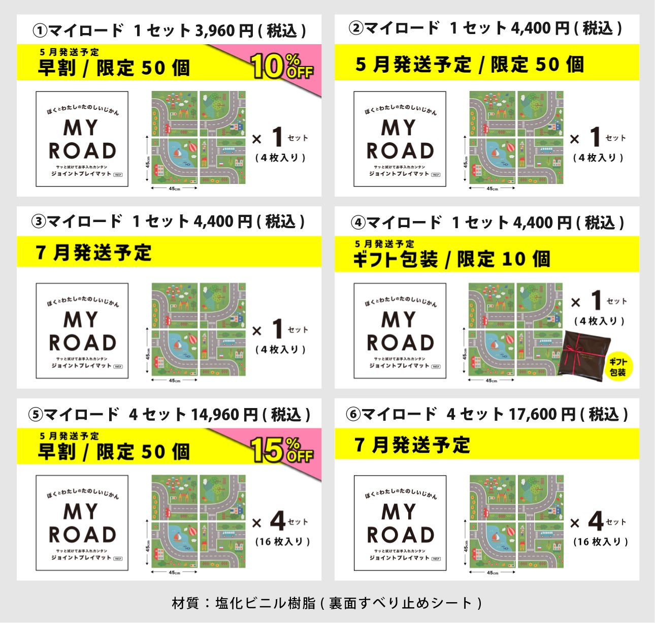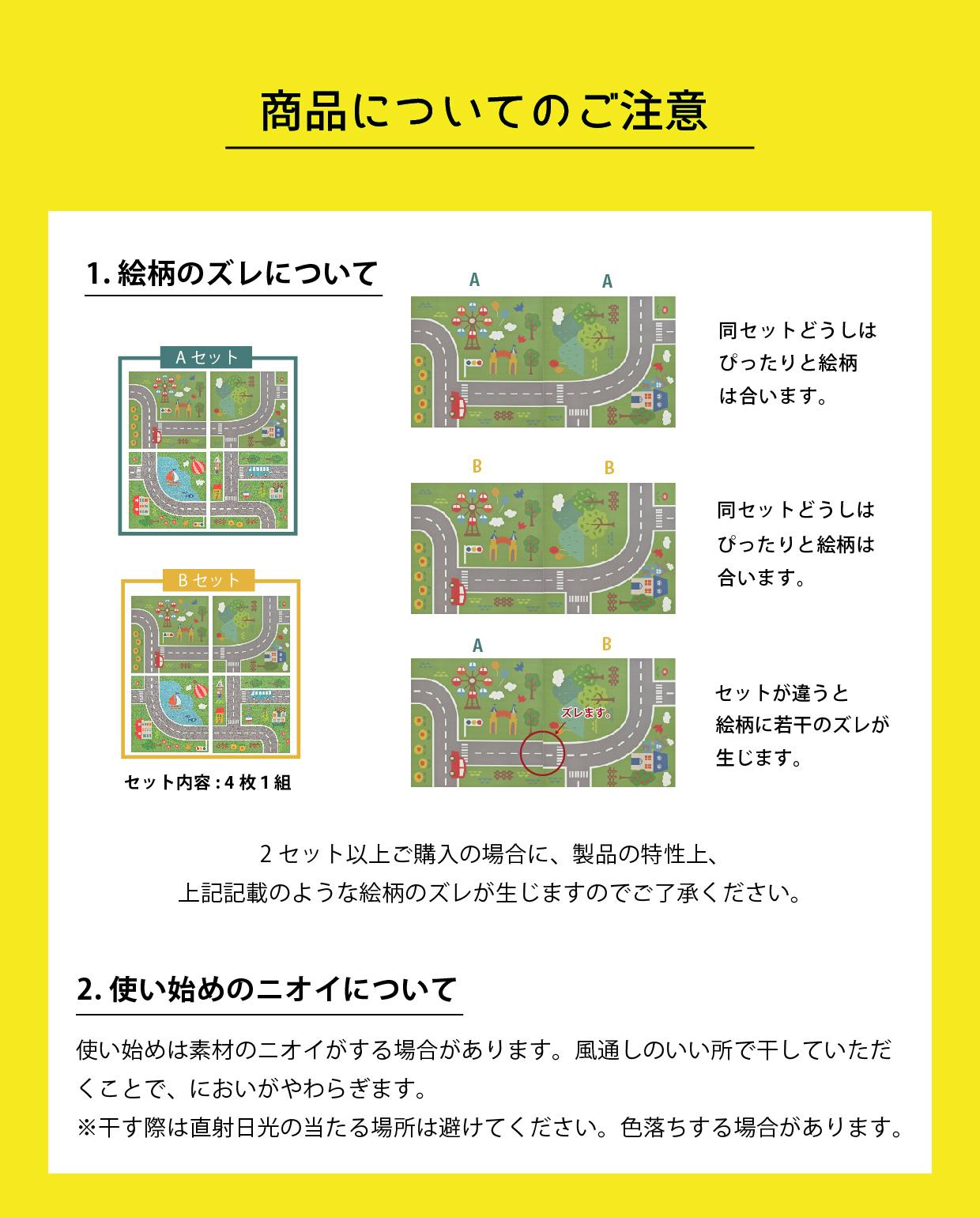 【開発のきっかけ】弊社ではふかふかパイル(毛足)でピタっと吸着する「ピタプラス」ジョイントラグ、「ピタぺトモ」ジョイントペットラグを販売してます。これらはお好きな場所の床に、並べて敷く商品でロングセラー商品となっています。1枚がコンパクトで、何枚でも敷きやすい、組み合わせ方でデザインを変更できるといった、並べて使うことならではの点もご指示いただいている一つの要素だと考えています。市場で販売している道路をデザインした1枚のプレイマットを見たとき「ピタプラス」「ピタぺトモ」の特徴である敷きやすさ、組み合わせることでデザインを変更できる部分があれば「使う子ども、親、両者にとって楽しく便利なものになるのではないか」と思い、マイロードの開発に取り掛かりました。プレイマットに必要な機能は何かを考え、素材の試作を繰り返した結果、クッション性があり、濡れてもサッと拭き取れる今の素材に辿り着きました。子どもはあっという間に成長しますが、その短い期間を充実したものになりますよう、そのサポートができる製品になればうれしいです。