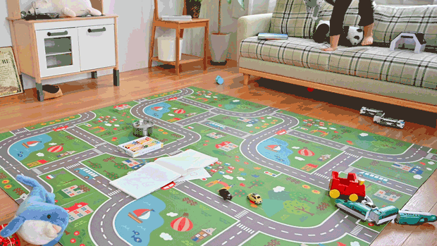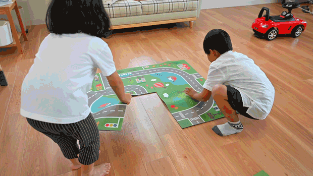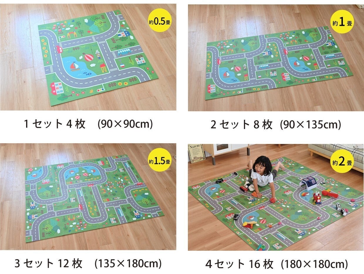 道路をデザインしているので、ミニカーを走らせたり、おままごとをして遊ぶことができます。