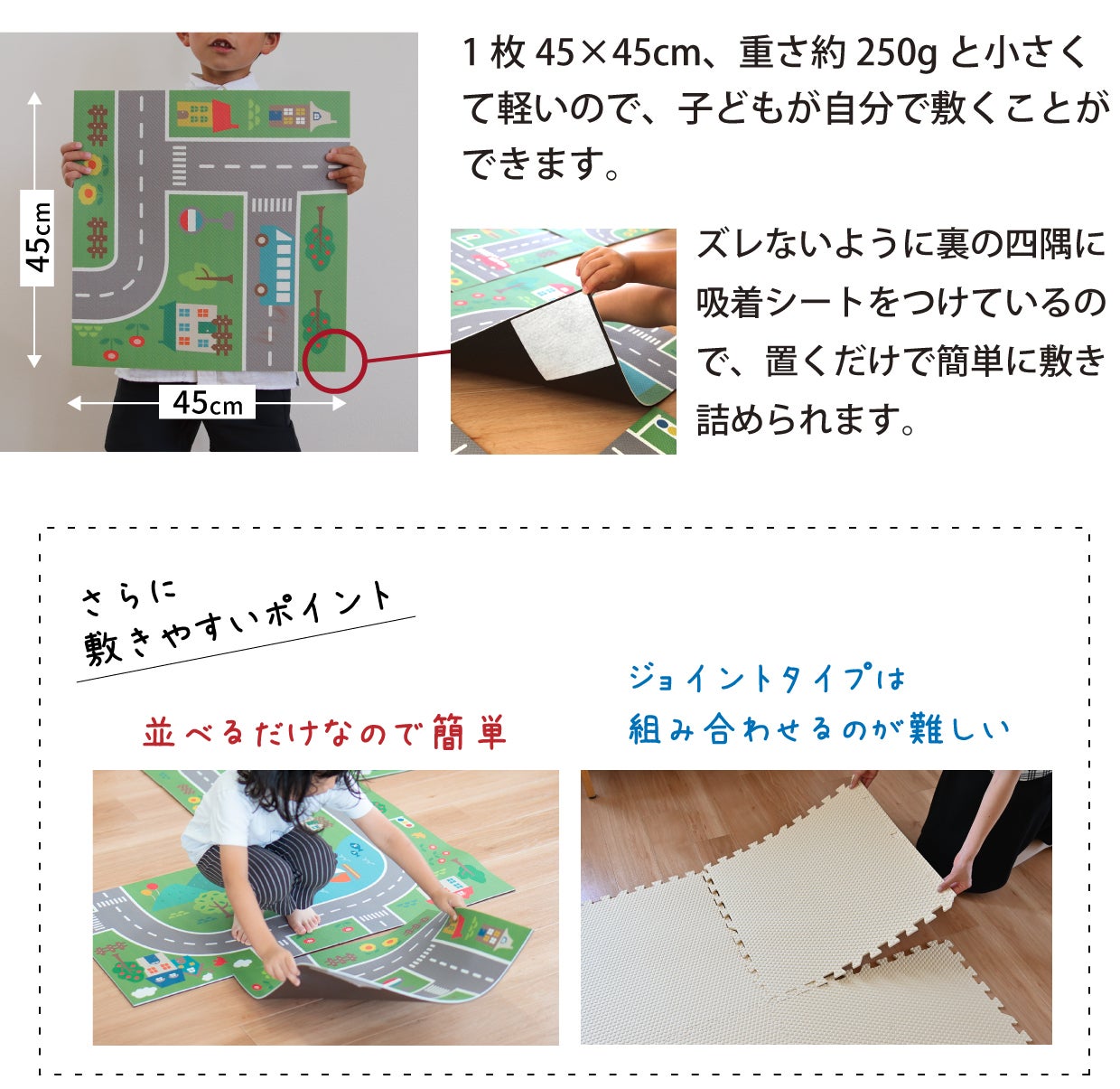 裏面の四隅に吸着シートを貼っていることで、上を歩き回ってもズレにくく、快適にご使用いただけます。