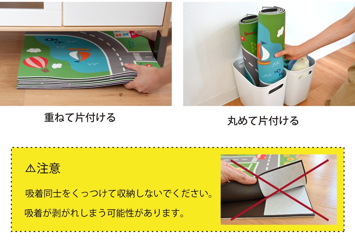 大きなマットだと畳むのが面倒だったり、収納場所に困ることも。並べるだけなので、取り外しも簡単です。また、1枚が小さいので小スペースに収納できます。丸めて収納しておけば持ち運びもらく。帰省するとき、お友達の家に遊びに行くとき、旅先のホテルなど、持ち運びしやすいです。