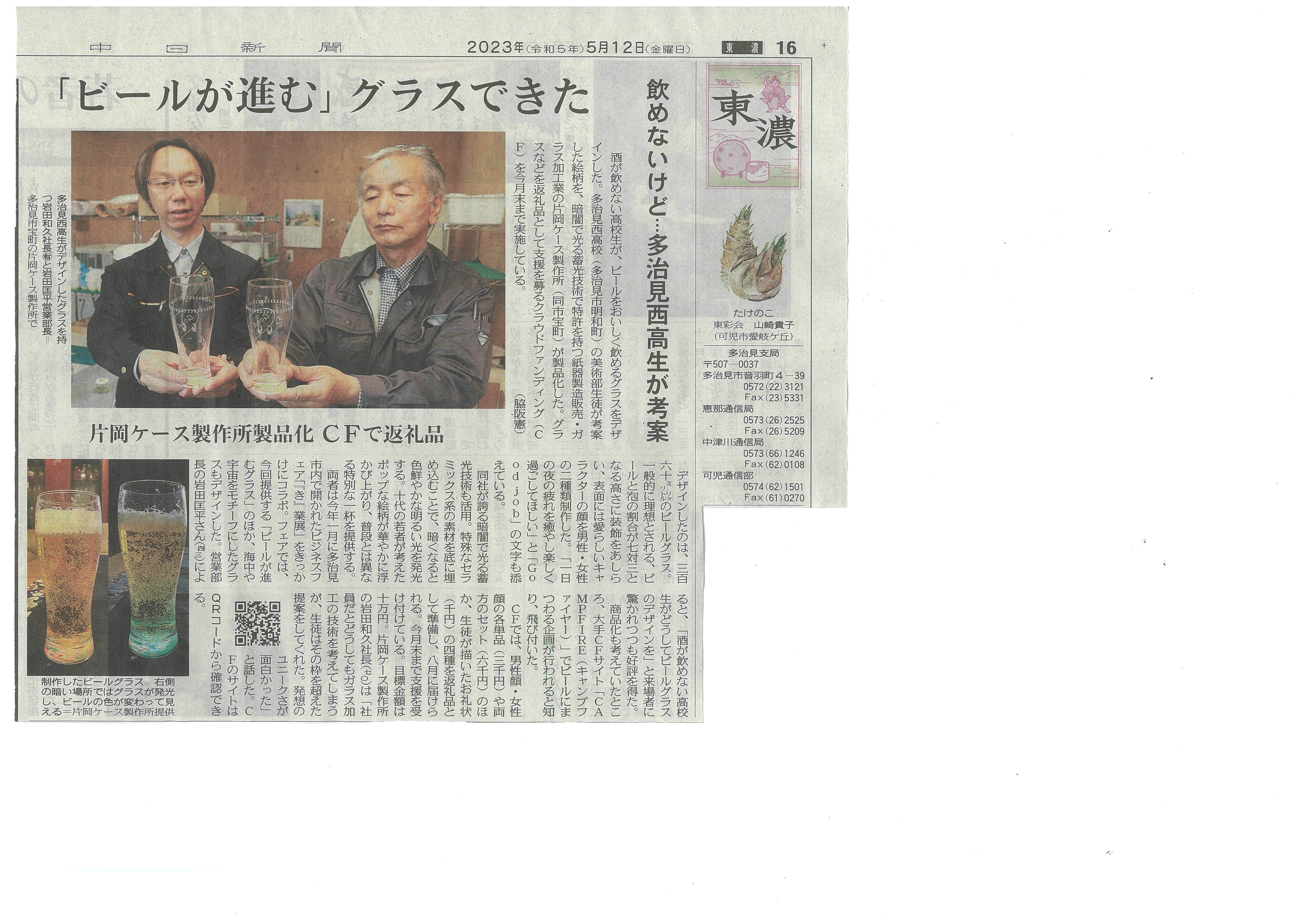 本日の中日新聞東濃版に掲載されました!多治見西高校美術部生徒さんが企画デザインした、「ビールが進むグラス」話題になっております!引き続き温かいご支援をお願い申し上げます。