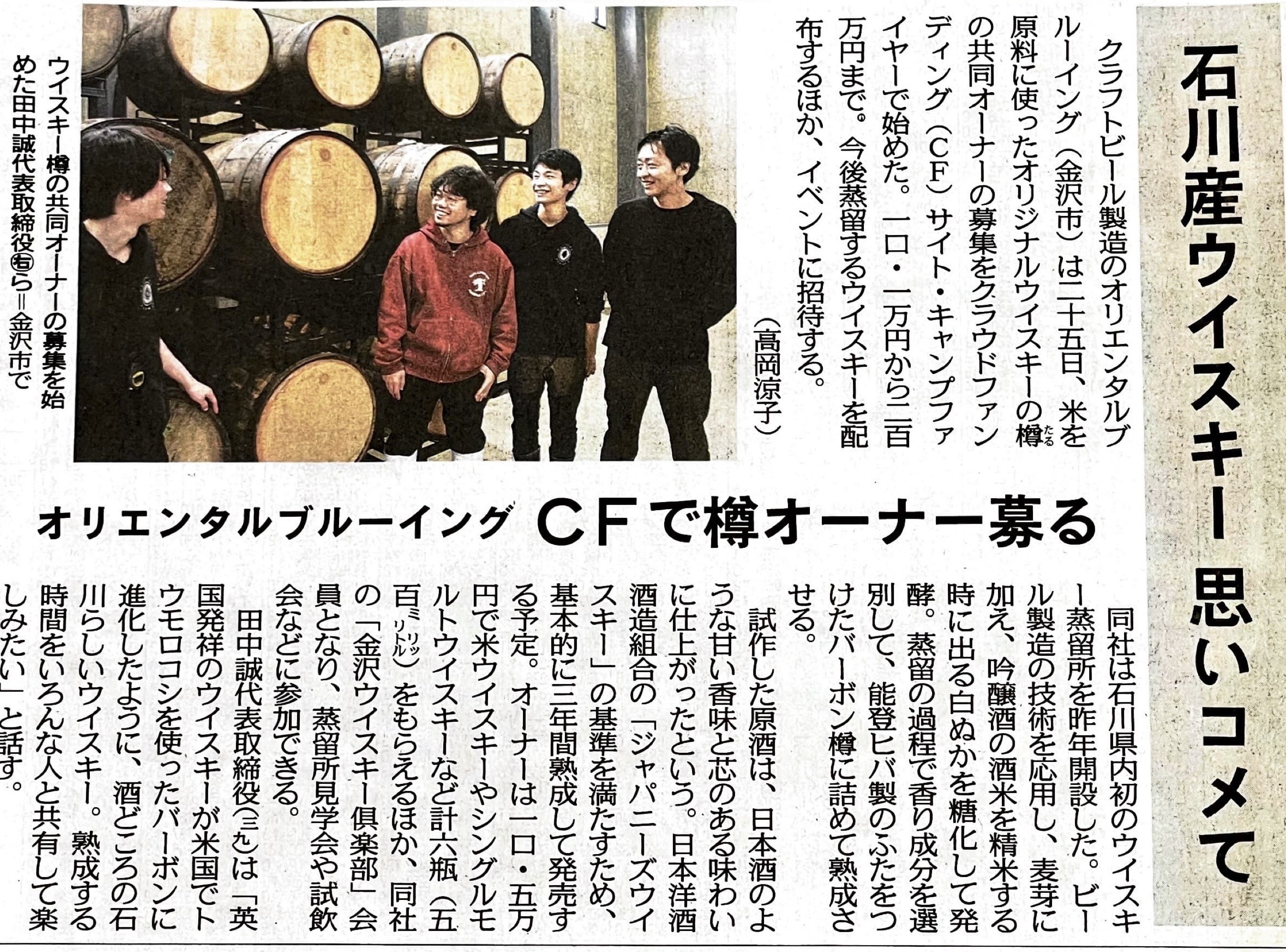 石川テレビの「石川さん Live News イット!」の取材を受けました。ニュースの中で、仕事人を紹介するコーナーがあり、その中でオリエンタルブルーイングに密着してもらいました!日常の会議風景からビールの仕込み、そしてウイスキーの蒸留まで密着。日頃の活動を知ってもらうことができると思います。代表の田中もインタビューを受けて、なぜ今ウイスキーか?を語っています。もちろん、今回のクラウドファンディングのこともお話ししています。お米のウイスキーの可能性を、たくさんの方に知って欲しい。石川の方、お時間ある方は、ぜひご覧ください。(放送は石川県内のみ)*地震など状況により変更になる場合があります石川さん Live News イット!現在の活動について