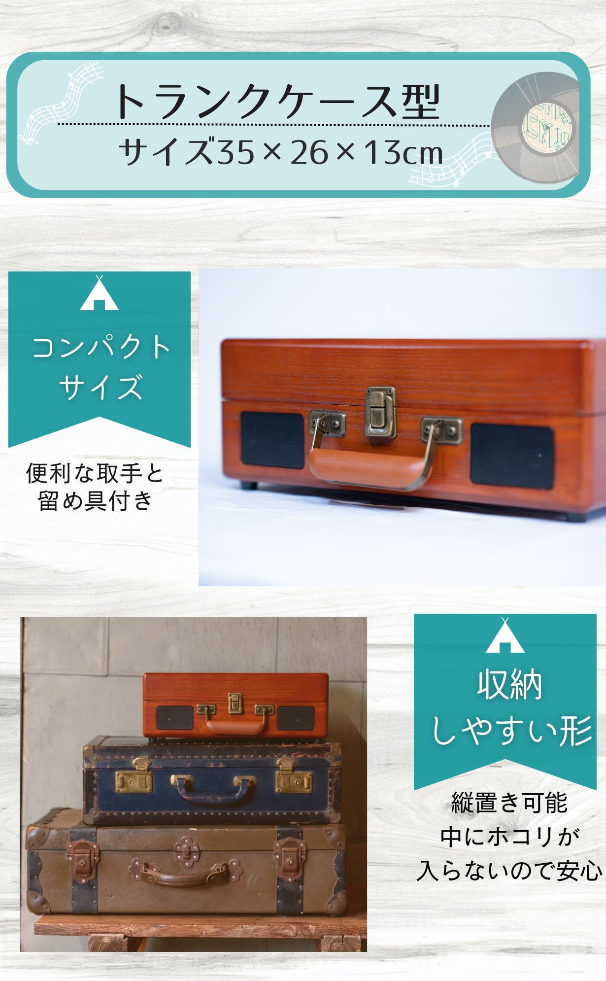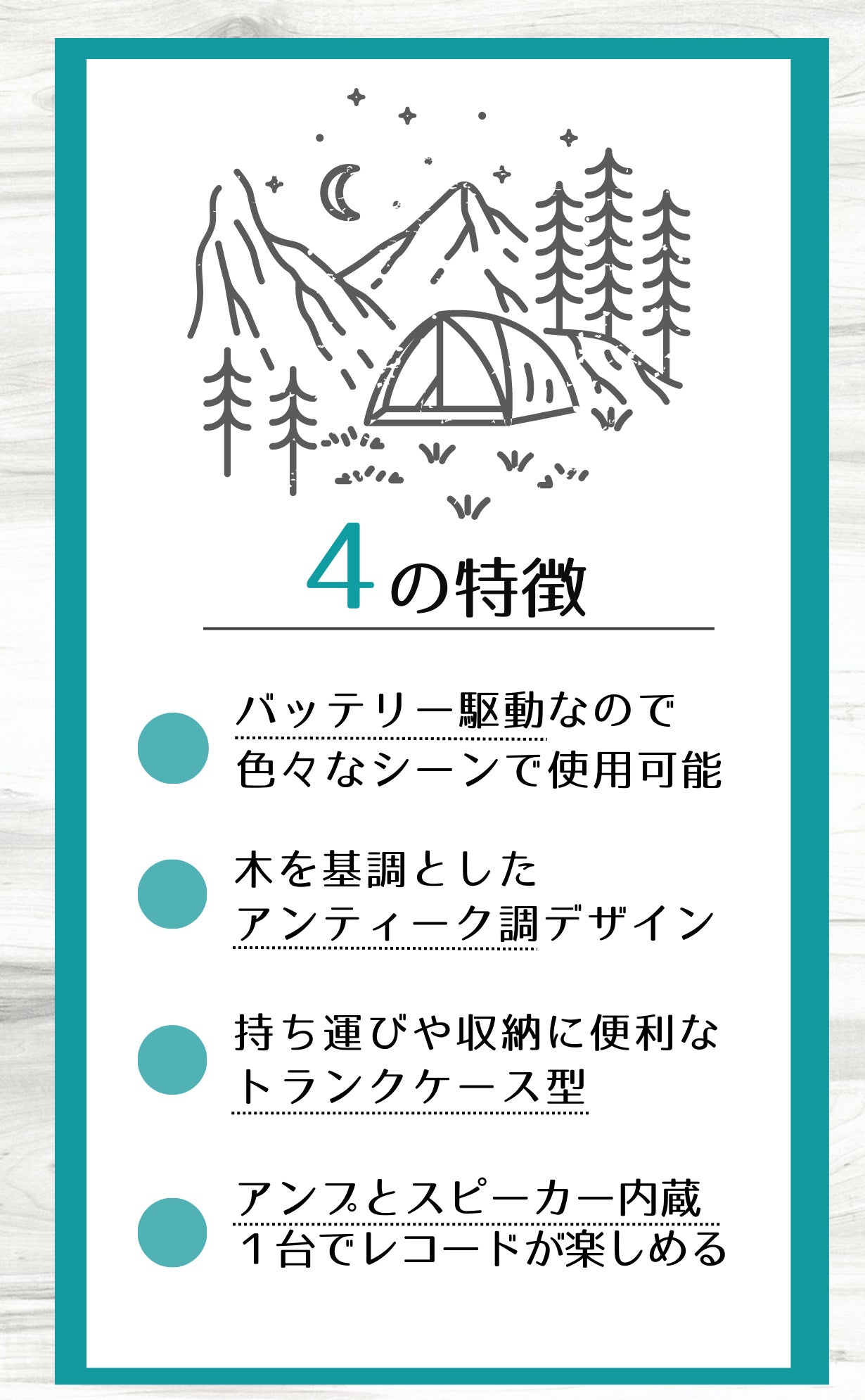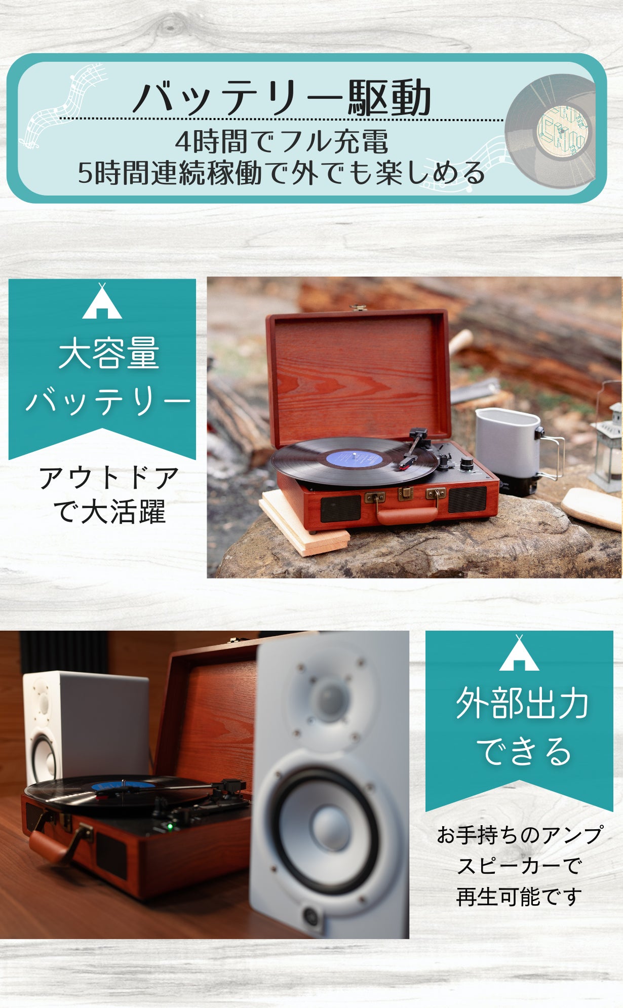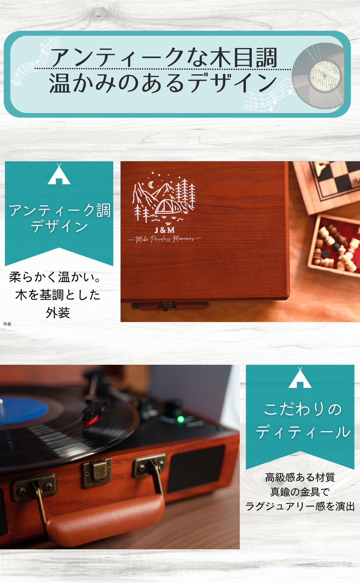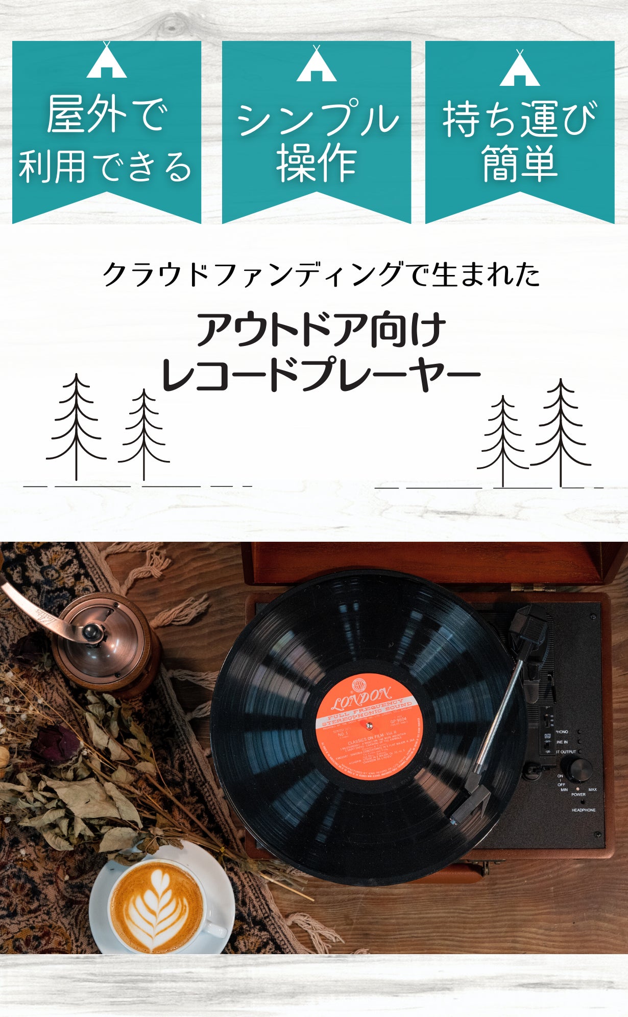「敷居が高そうなイメージがあるけど、自分の部屋でレコードを聴いてみたい。」「大自然の中で、好きな曲を、少しお洒落に楽しみたい。」「豊かなサウンドで、大切な人との時間を過ごしたい。」そういった思いを叶えられるよう、心を込めて設計しました。