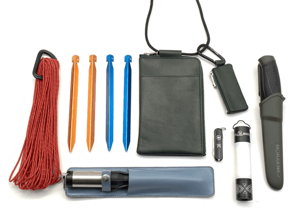 キャンプでは、ペグ、ナイフ、ライト等、バラバラになりがちな必需品をひとつにまとめることができます。