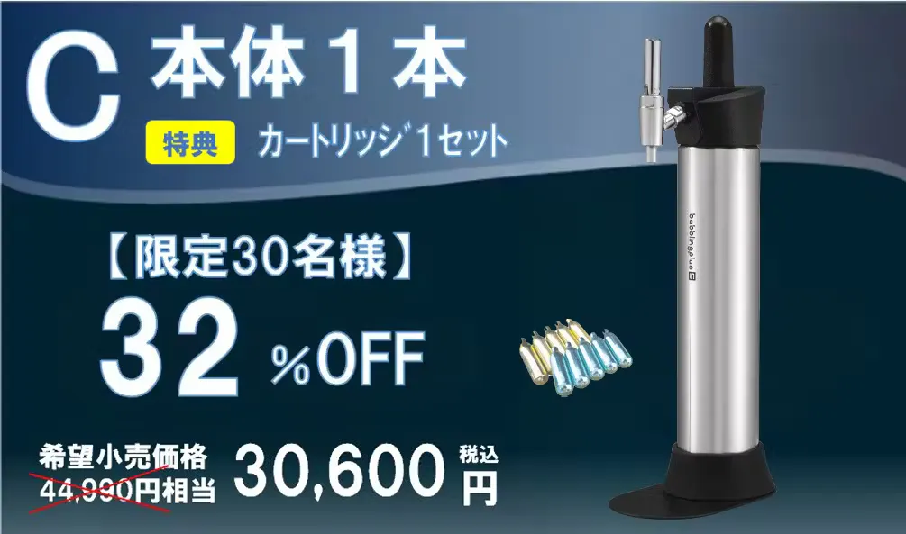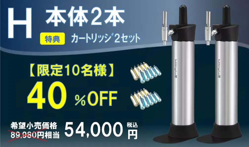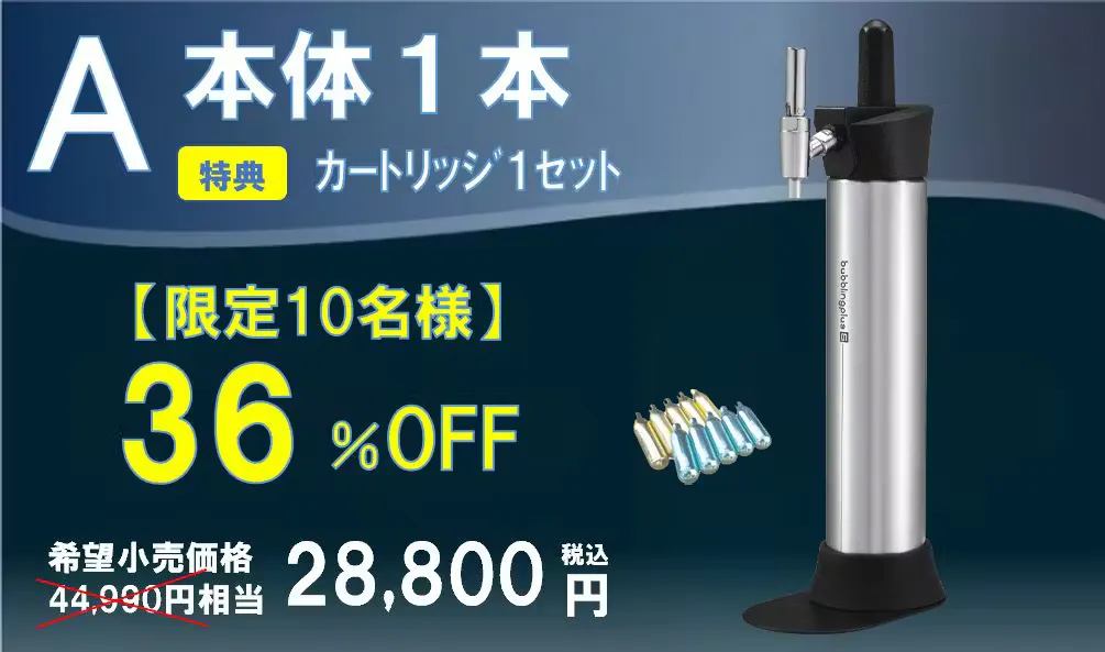 ■ 今回だけのお得な特典! 本商品は別売りのガスカートリッジが必要となっておりますが、今回に限り商品到着後すぐに使用していただけるよう、特別にCO₂(炭酸)N₂(窒素) のカートリッジをセットにいたします。※カートリッジ本数はリターン毎に異なります。