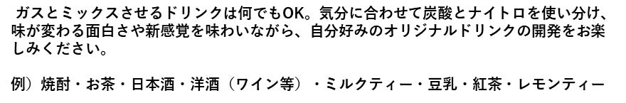 一般的に普段飲まれているドリンクであれば使用可能です。限定的でないところもこの商品の強みですので、是非ともいろいろなドリンクを窒素や二酸化炭素と組み合わせて新たなオリジナルドリンクを開発してみることをオススメ致します。
