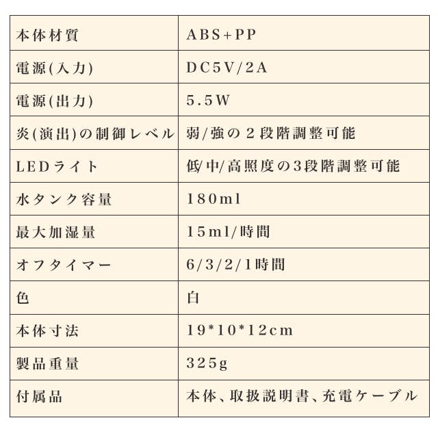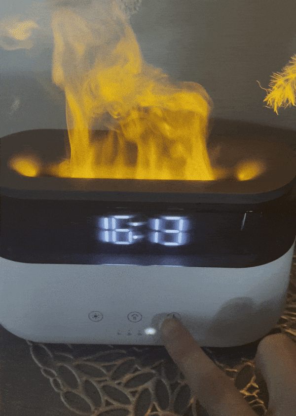 丸みを帯びたフォルムにアラームクロックを組み合わせ、オシャレな見た目だけでなく使い勝手も良い「ファイヤー・ミスト」。最大の特徴は噴霧されるミストがLEDライトで照らされて、まるで炎のゆらめきに見えること。
