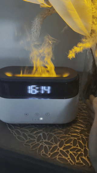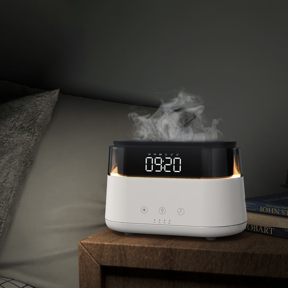 「HUMIDIFIER」は、丸みを帯びたフォルムにアラームクロックを組み合わせ、オシャレな見た目と使い勝手の良さが特徴の「ファイヤーミスト」です。LEDライトと加湿器機能を備えており、噴霧されるミストがライトで照らされるため、まるで炎のゆらめきが広がり、リラックス効果が高まります。