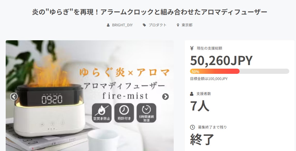 サポーターの皆様、 Brightチームです。お世話になっております。 プロジェクト開始から36日目で7人もの支援者の方々よりご支援を頂き、無事プロジェクト終了を迎えることが出来ました。 早速皆様のリターンを2023年07月末にお届けできるよう準備を始めております! 皆様にご満足いただけるリターンをお届けできるよう、全力で取り組んで参りますので引き続き、「炎の"ゆらぎ"を再現!アラームクロックと組み合わせたアロマディフューザー」をよろしくお願い致します。 Brightチーム