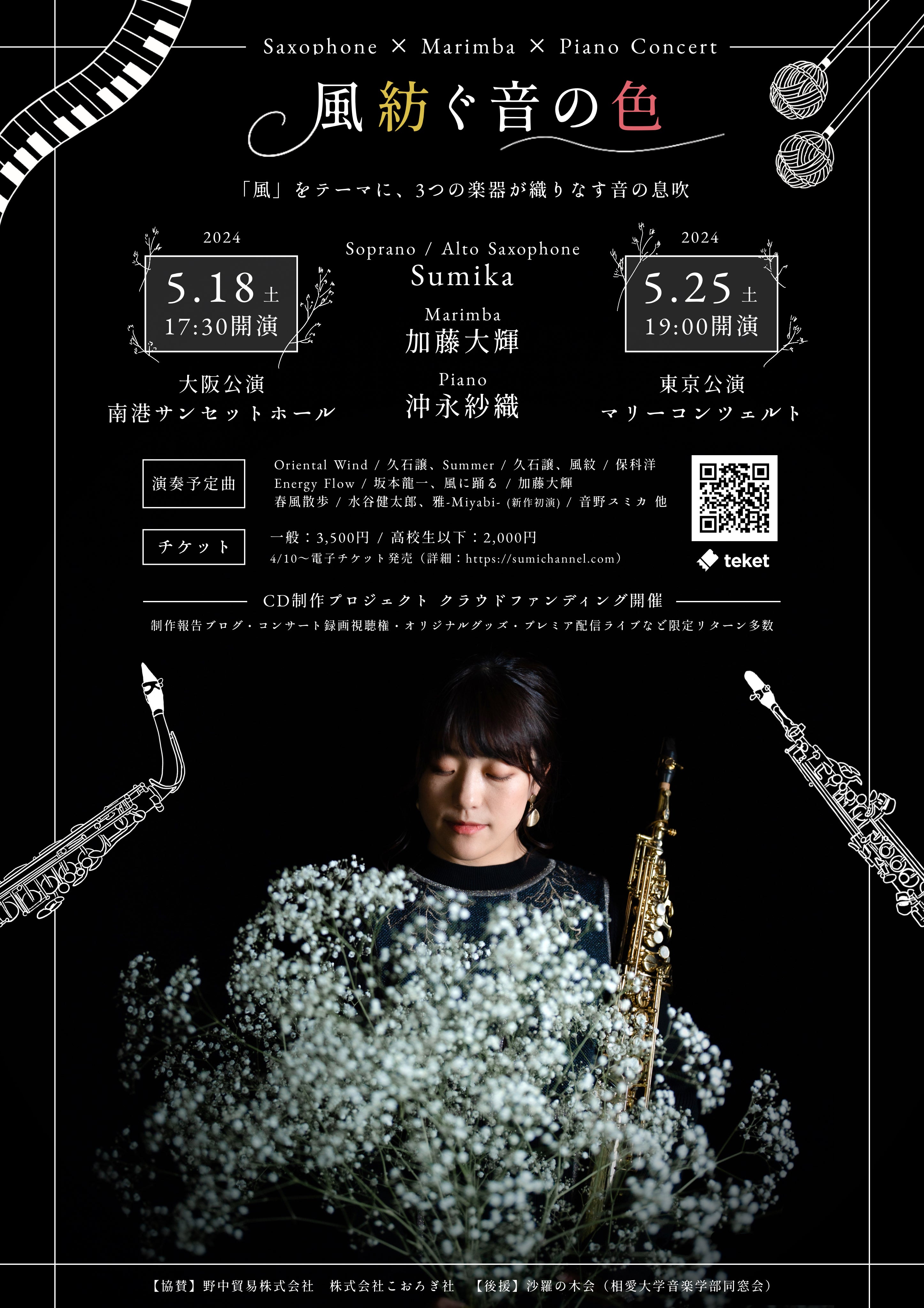 日本を代表する作曲家である久石譲さん、坂本龍一さんの作品に加え、今も愛され続ける吹奏楽コンクール課題曲の名曲・保科洋さんの「風紋」、そしてマリンバを担当いただく加藤大輝さんの作品「風に踊る」、CD「音ノ雨」で作品を書き下ろしていただいた水谷健太郎さんの作品「春風散歩・帰路」、そしてSumika自身が「音野スミカ」として今回のCDのために書き下ろす、ソプラノサクソフォンのための「雅 -Miyabi-」を収録。