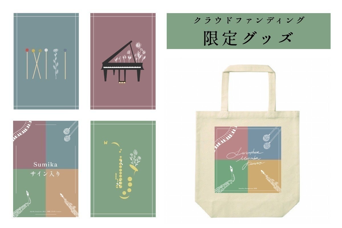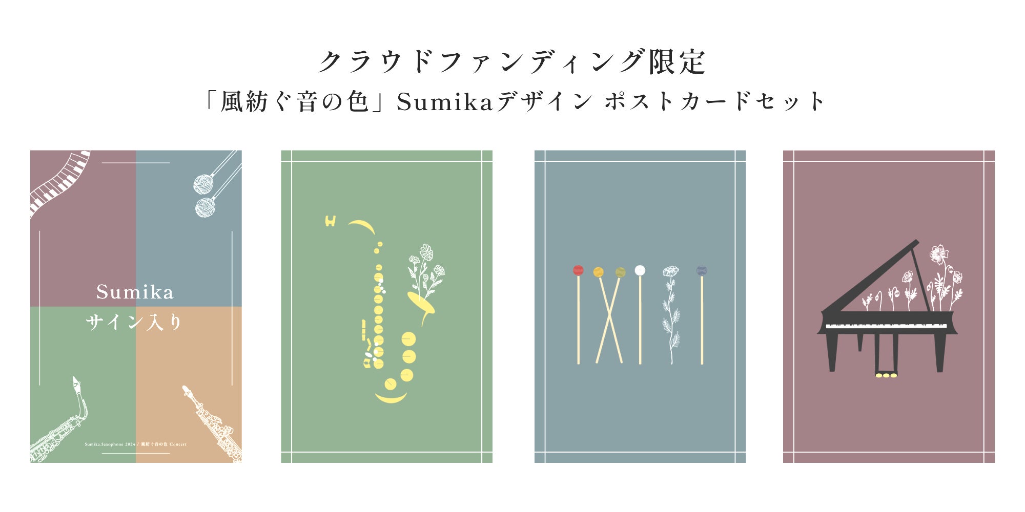 Sax、Marimba、Pianoのオリジナルデザインのポストカード4枚セット。Sumikaによる特別デザインです。(内1枚にSumikaの直筆サイン入り)