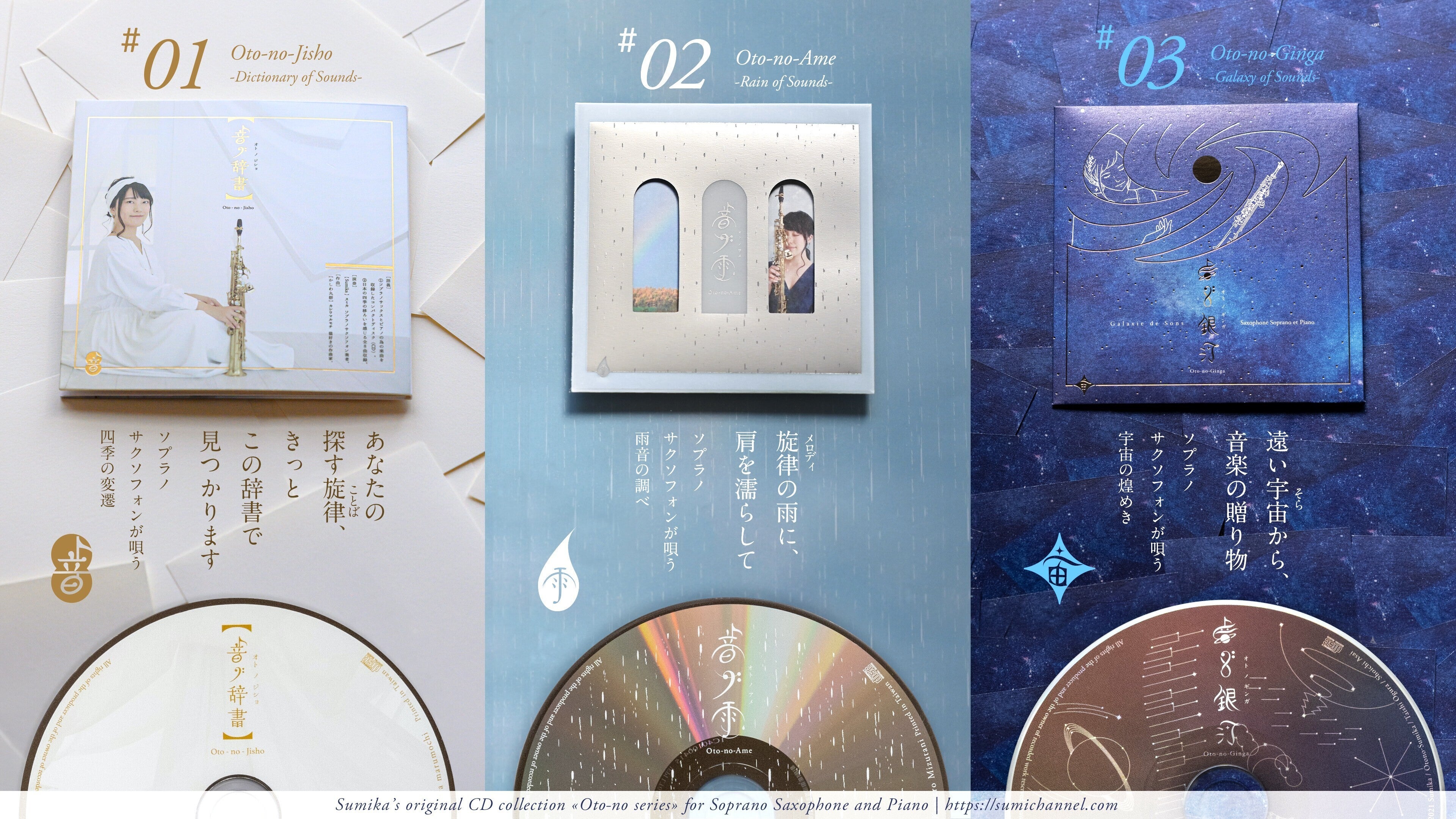 今までデザインをご担当いただいた作品達「音ノ辞書」「音ノ雨」「音ノ銀河」