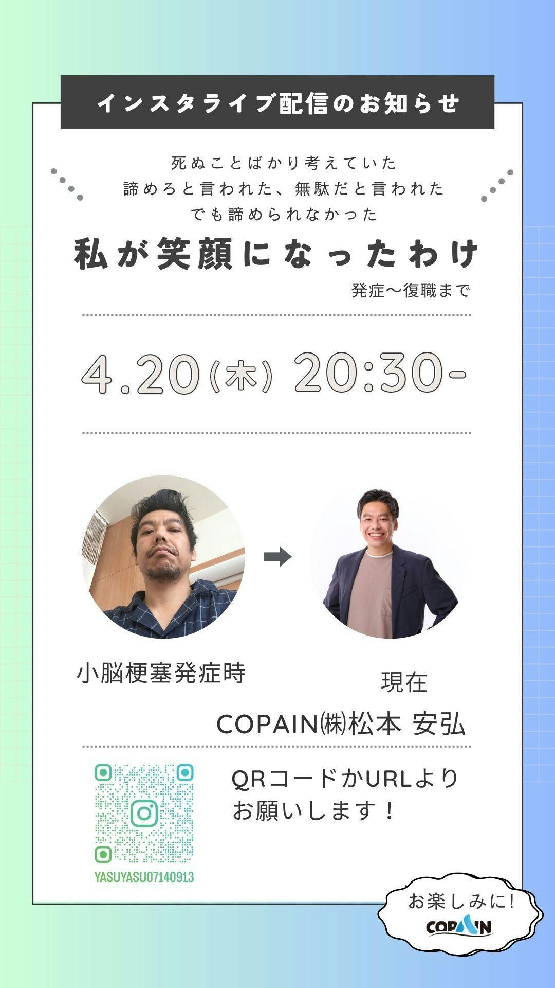 自身が小脳梗塞を発症したことをきっかけに遠隔リハビリサービスに取り組み始めた、笑顔プロジェクト代表である松本によるインスタライブです。