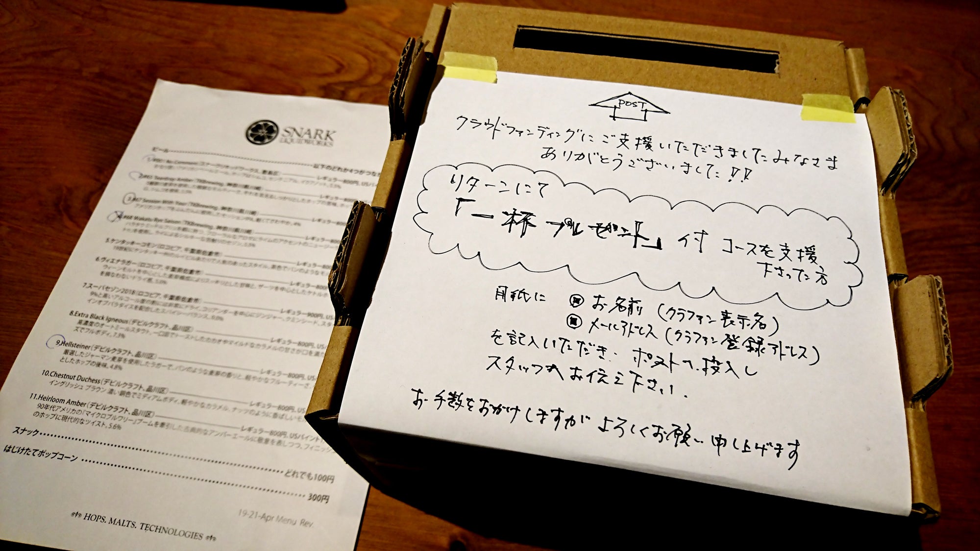 2019/04/27 13:365/3(金)以外は休まず営業致します「一杯プレゼント」付きのご支援を頂きました方は、カウンターにてその旨お伝えいただき、上記写真のポストにお名前(クラウドファンディング上に表示されるお名前)と(クラファンに設定している)メールアドレスをご記入・投函いただいた後、一杯お受けとりくださいませ。お手数をおかけしますがよろしくお願い申し上げます。その他リターンに関しましては、ご用意出来次第お送りさせていただきます。GW都内にいらっしゃっるかた、是非お越しください!!! ◆4/27(土)~4/28(日) 15:00~21:00 ビアパブ営業◆4/29(月)~5/2(木) 12:00~15:00 岡野さんのカレーランチ 15:00~21:00 ビアパブ営業◆5/3(金) ビアパブ定休日 ですが、、、 18:00~20:00 「コレデイイノダラジオ」パーソナリティー集合公開収録やります! ※どなたでもご覧いただけます。もしかしたら出演いただきます。※観覧の方へはクラフトビールをカップのみの提供で、800円/杯となります ◇5/4(土)17:00~18:00 オープントーク!!! 「池袋モンパルナスとアーティスト・イン・レジデンスについて 」杉並区にてアーティスト・イン・レジデンス、遊工房アートスペースを主宰されている村田弘子さん、村田達彦さん。池袋モンパルナス最後の一件、西田邸の改修を手掛けた春日部幹さん、春日部陽子さんをお迎えして、アーティスト・イン・レジデンスの魅力や、街にあることの意義、シェアエコノミーとの関係等をお伺いします◆5/4(土)~5/6(木) 12:00~15:00 岡野さんのカレーランチ 15:00~21:00 ビアパブ営業 【岡野さんのカレーランチ!とは】新大久保にあったスパイスカレーの名店「タピ(TAPiR)」の店主岡野さんがSnark Liquidworksの厨房に入っていただくことになりました!アーティストでもある岡野さんのスパイスの芸術、カレーランチと、ビールに合うおつまみをお楽しみください! もっと見る