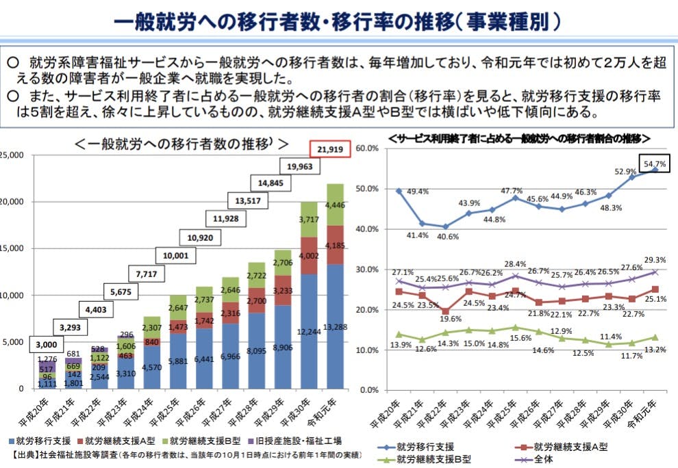 近年、障害者の就労支援対策として、就労移行支援、就労継続支援A型、就労移行支援B型、就労定着支援など障害福祉サービスが充実しています。そして、就労系障害福祉サービスから一般就労への移行者数は毎年増加している傾向があります。(図の参照)