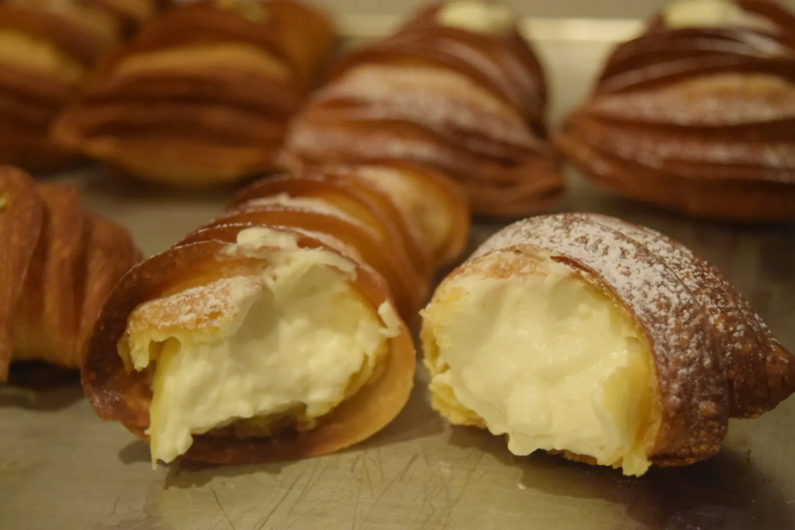 こちらはスフォリアテッラの兄弟のようなお菓子で、バリバリとしたスフォリアテッラと同じ生地の中にシュークリームの生地を入れて焼き空洞を作り、そこにカスタードと生クリームを合わせたクリームを詰めます!