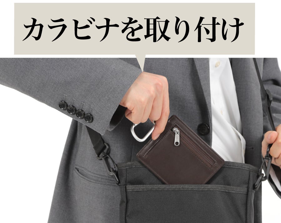 カラビナ等を付けると、バッグからすぐに取り出せます