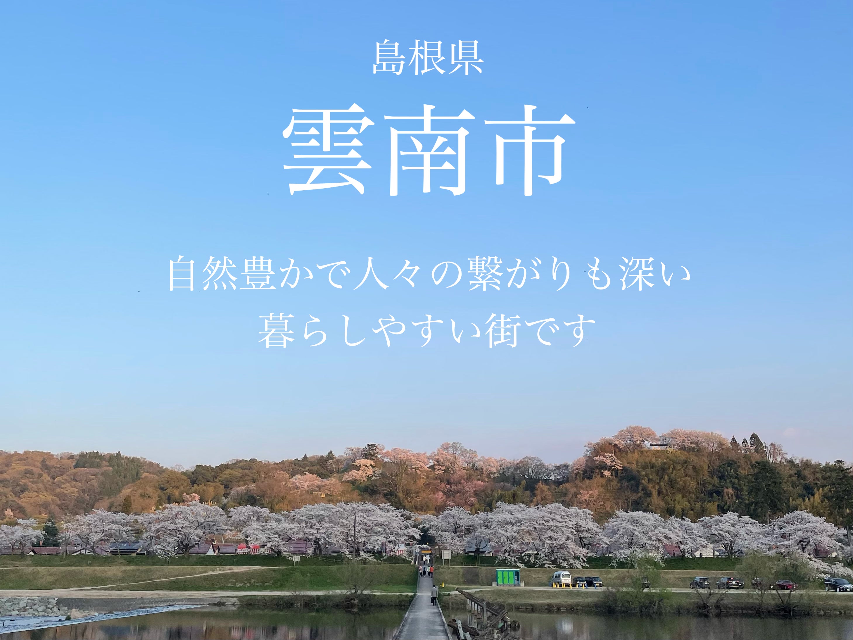 雲南市はとても自然の豊かな街です。美しい滝や棚田もあり、春になるとあちこちで桜の花が満開になります。そして雲南市は人と人との関わりが深く、人々の温かさもまた雲南市の魅力です。宝島社が発表した「住みたい田舎」ベストランキングで、若者世代・単身者と子育て世代の2部門で全国1位を獲得しました。ぜひ雲南市を訪れて、日ごろの疲れを癒してください。