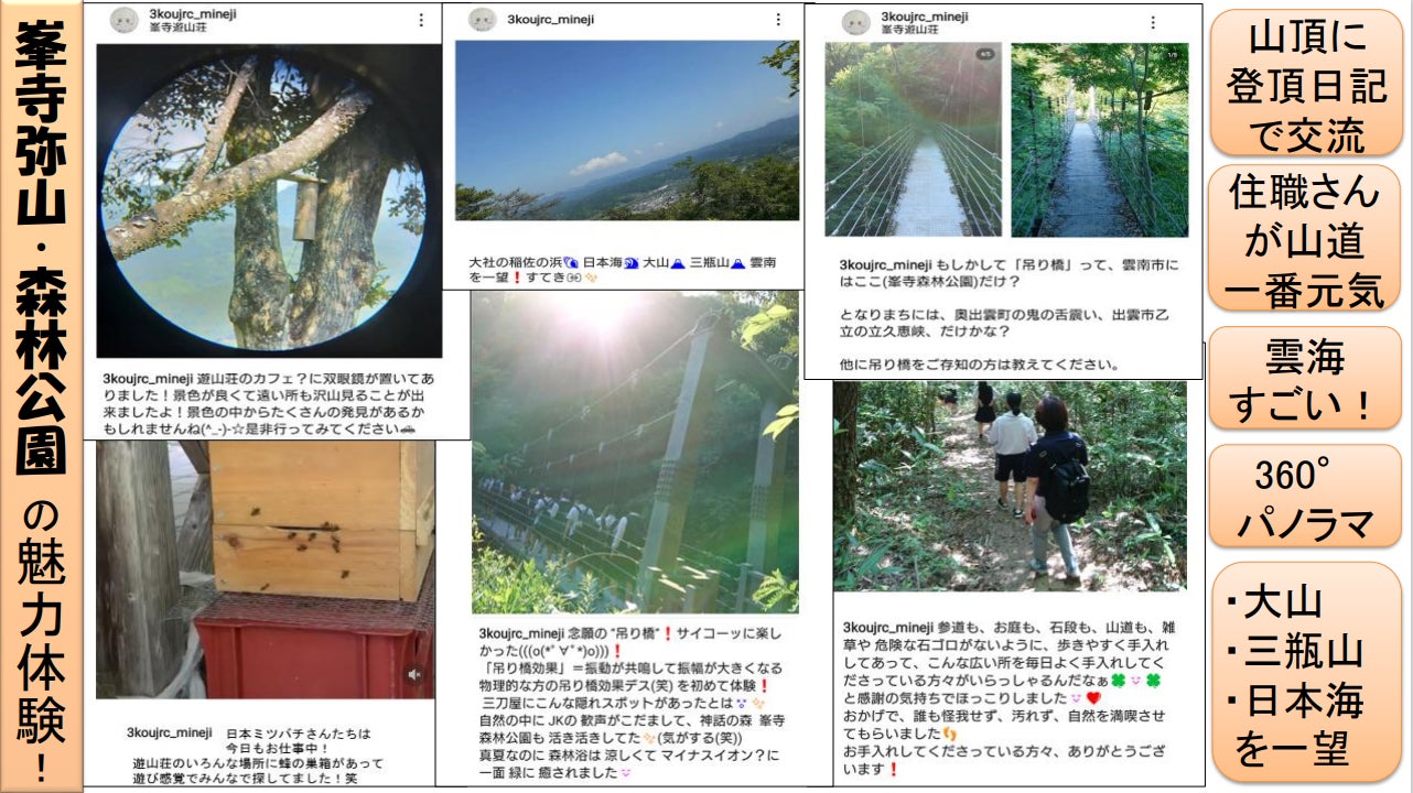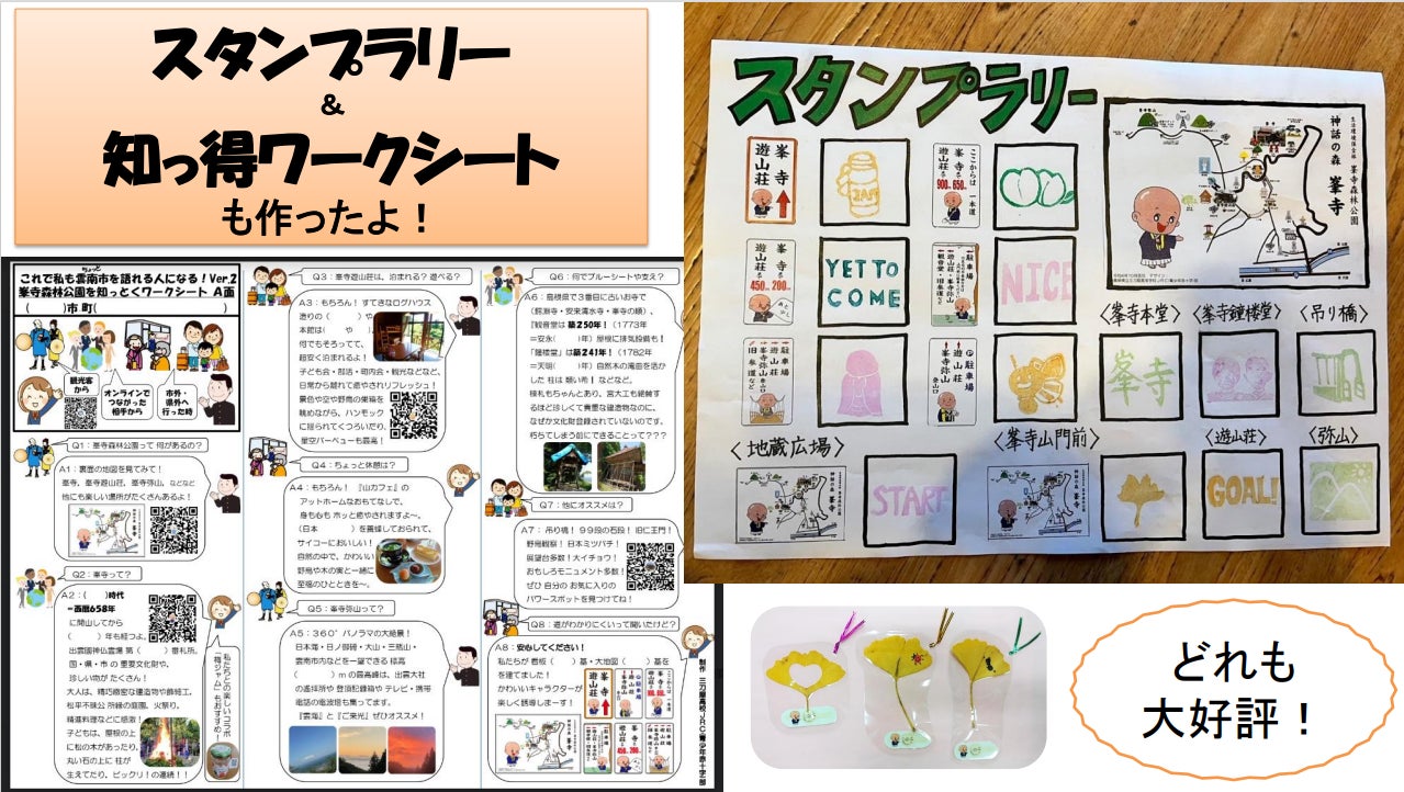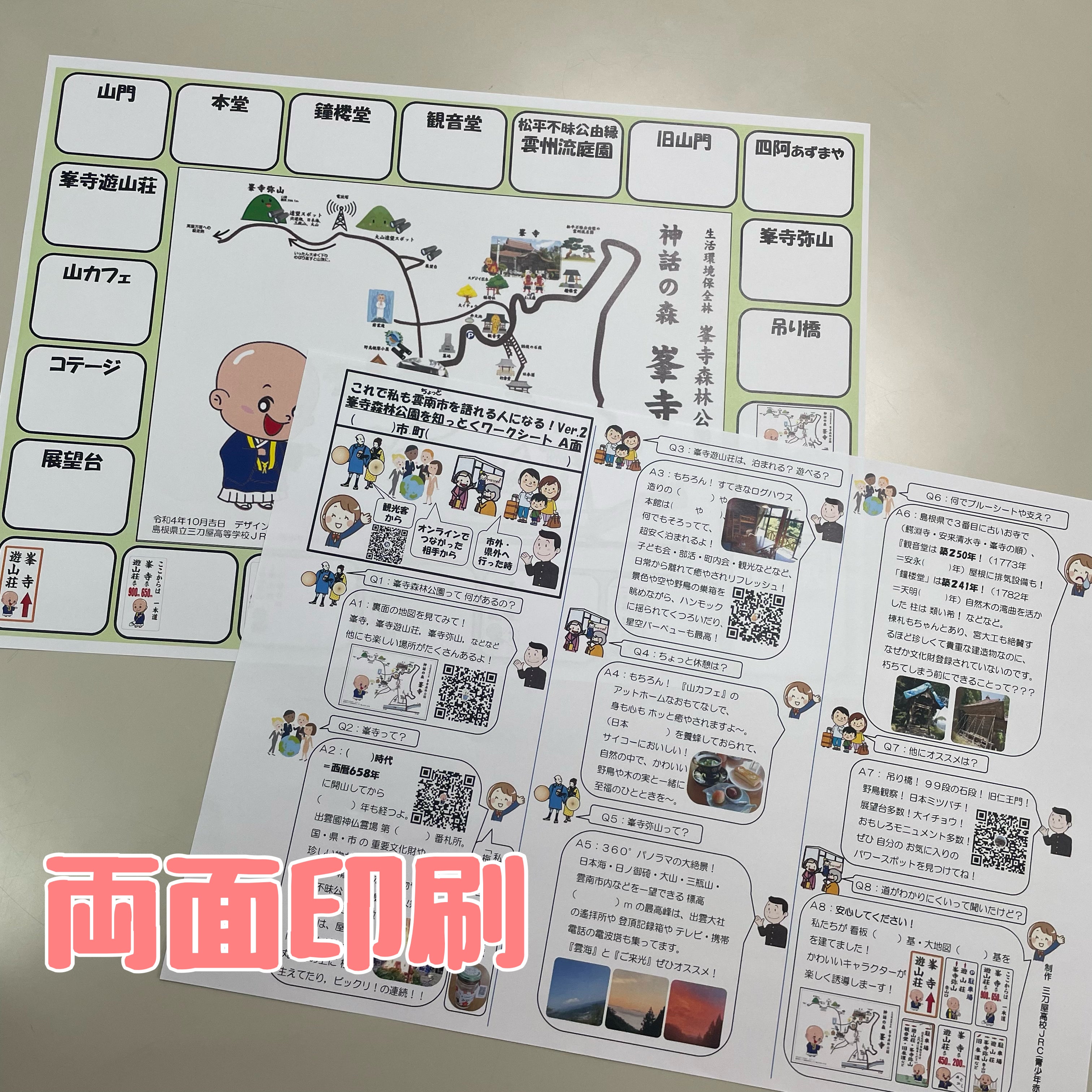 峯寺森林公園(峯寺・峯寺遊山荘・峯山弥山・吊り橋など)の、飛鳥時代から守り伝えられてきた悠久の文化、江戸時代に建立された珍しい匠の技の数々、他では味わえない癒し空間などなど、素敵な魅力を伝えたい!と、三刀屋高校JRC部が楽しいワークシート・スタンプラリーを作ってくれました!いろんなデザインのスタンプもJRC部の手彫りです!見るだけでもワクワクするシート、ぜひお楽しみください!(スタンプは雨風を避けるために峯寺で保管している場合がありますが、スタンプ要所を写真で撮影してまわり、峯寺に到着してからスタンプを押してお楽しみいただけます。)