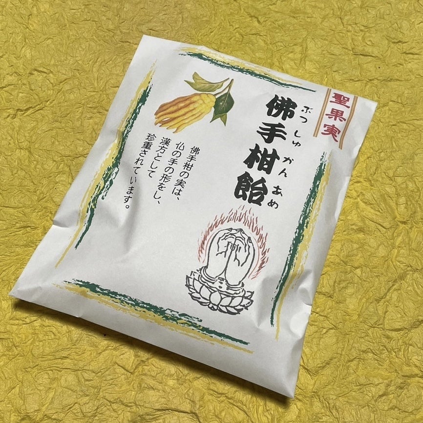 峯寺でお土産として参拝された方などにお配りしている仏手柑長寿飴です。仏手柑とは合掌している手に似ていることからそのように呼ばれており、古来より漢方として珍重されている柑橘系の果物です。オレンジのような味で爽やかで食べやすいです。