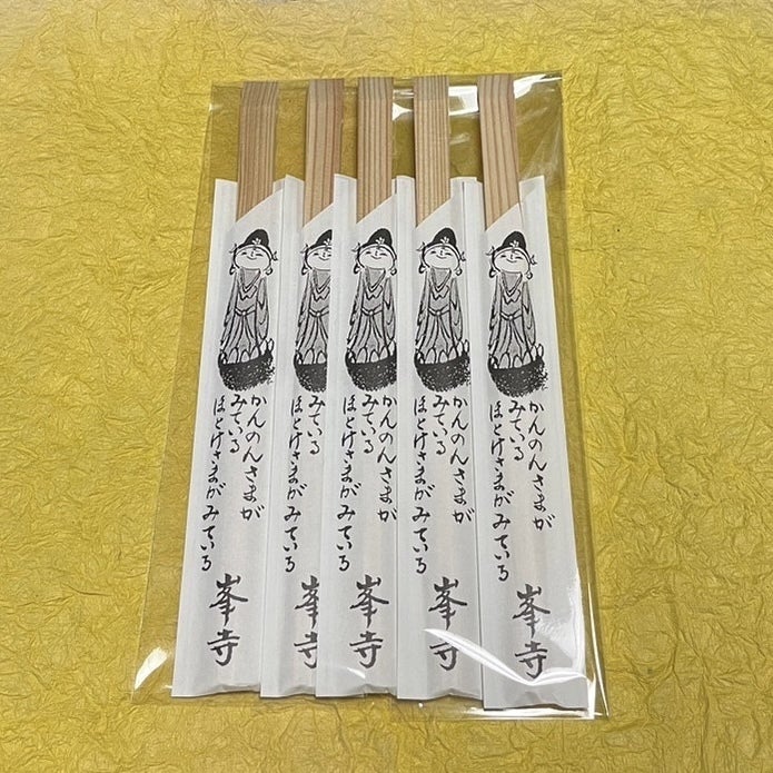 峯寺で精進料理などを振舞う際に使用している割り箸。割り箸の袋は先代住職の妻がデザインしたもので、あたたかい気持ちになるほっこりとしたデザインです。峯寺を開かれた役行者(えんのぎょうじゃ)所縁の地、奈良県吉野の間伐材を利用したものです。