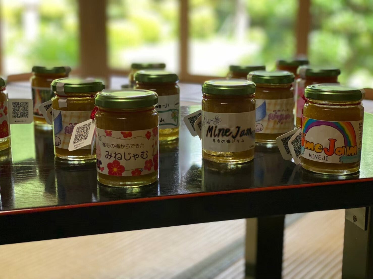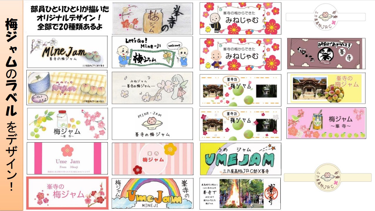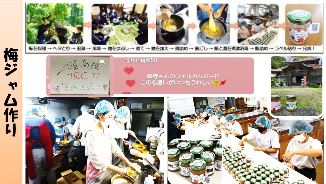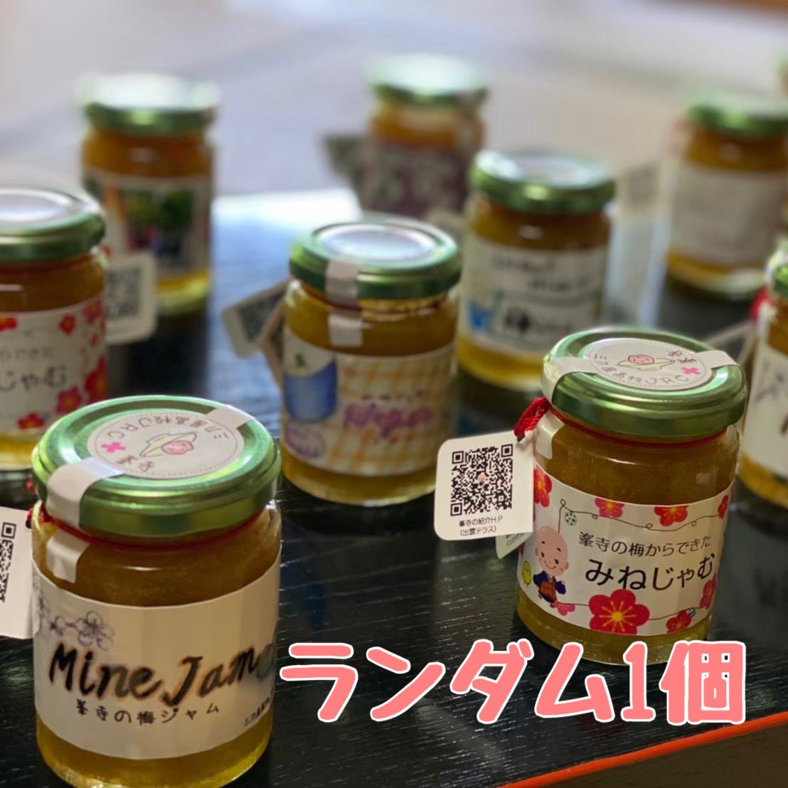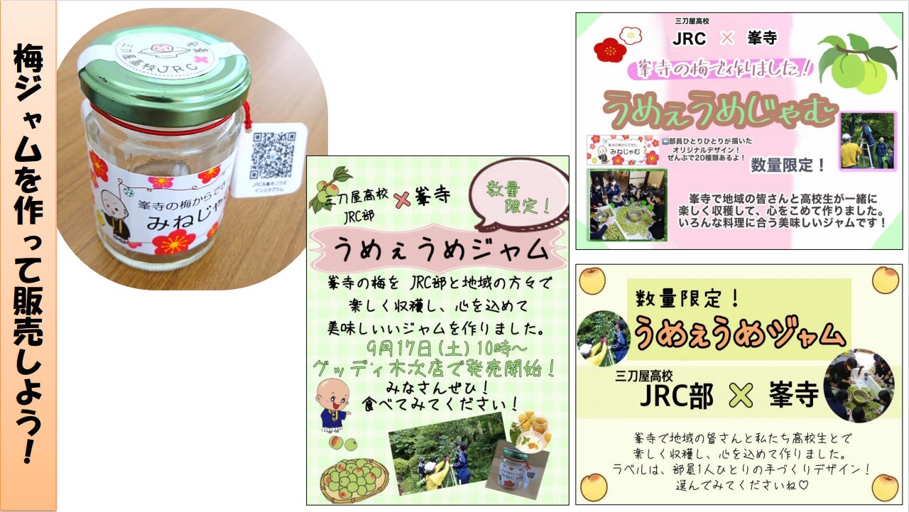 峯寺の境内で実った梅を、地域の方々と三刀屋高校JRC部が交流を兼ねて楽しく収穫し、心を込めておいしい梅ジャム「みねじゃむ・うめぇ梅ジャム」を作りました。ラベルのデザインも三刀屋高校JRC部が考えてくれました。地元では口コミで大好評となり、昨年は地元スーパーの地産地消コーナーで行列ができ、30分で完売したほど、入手困難な人気の梅ジャムです。そのため、限定10個とさせていただいております。