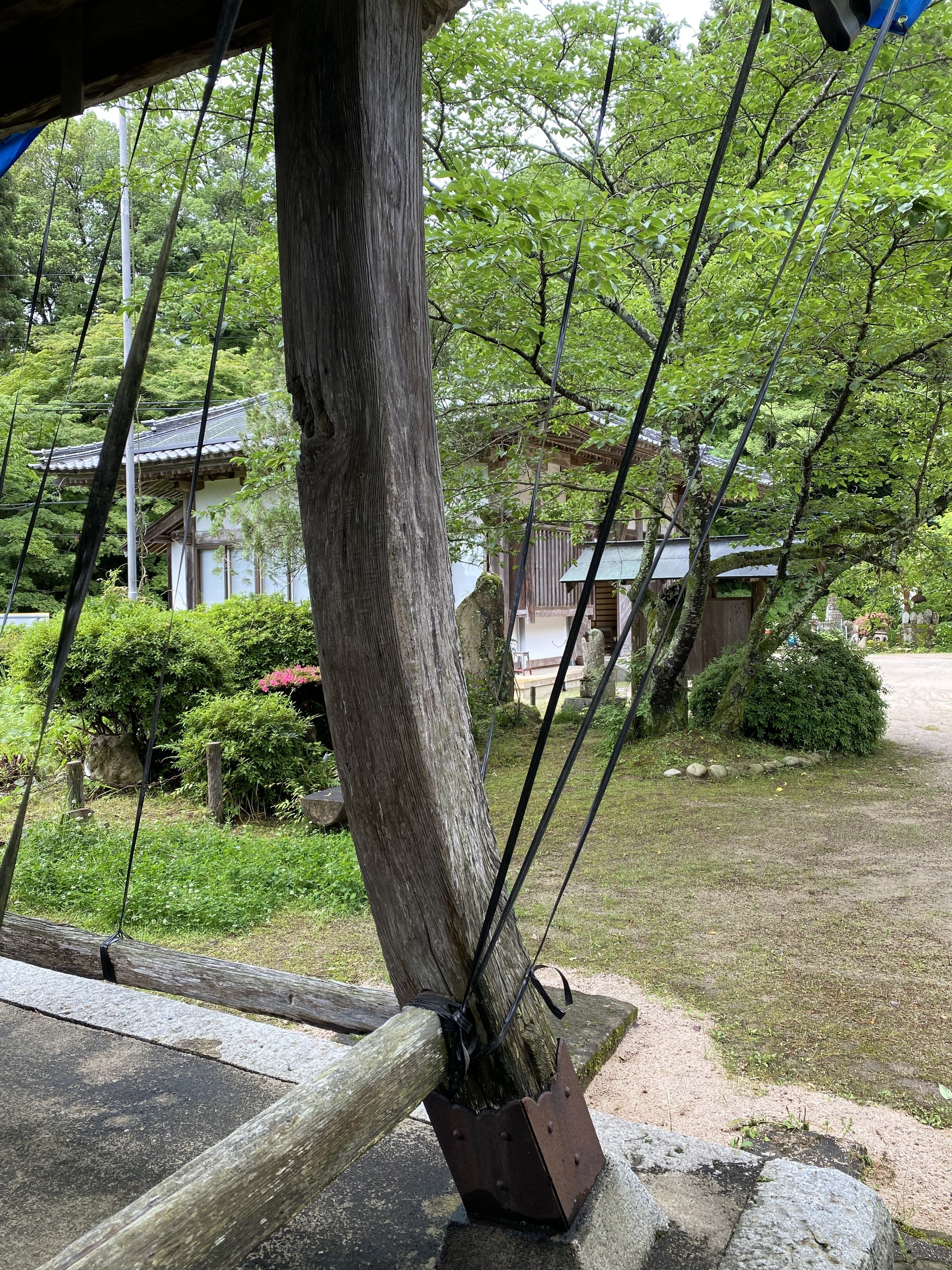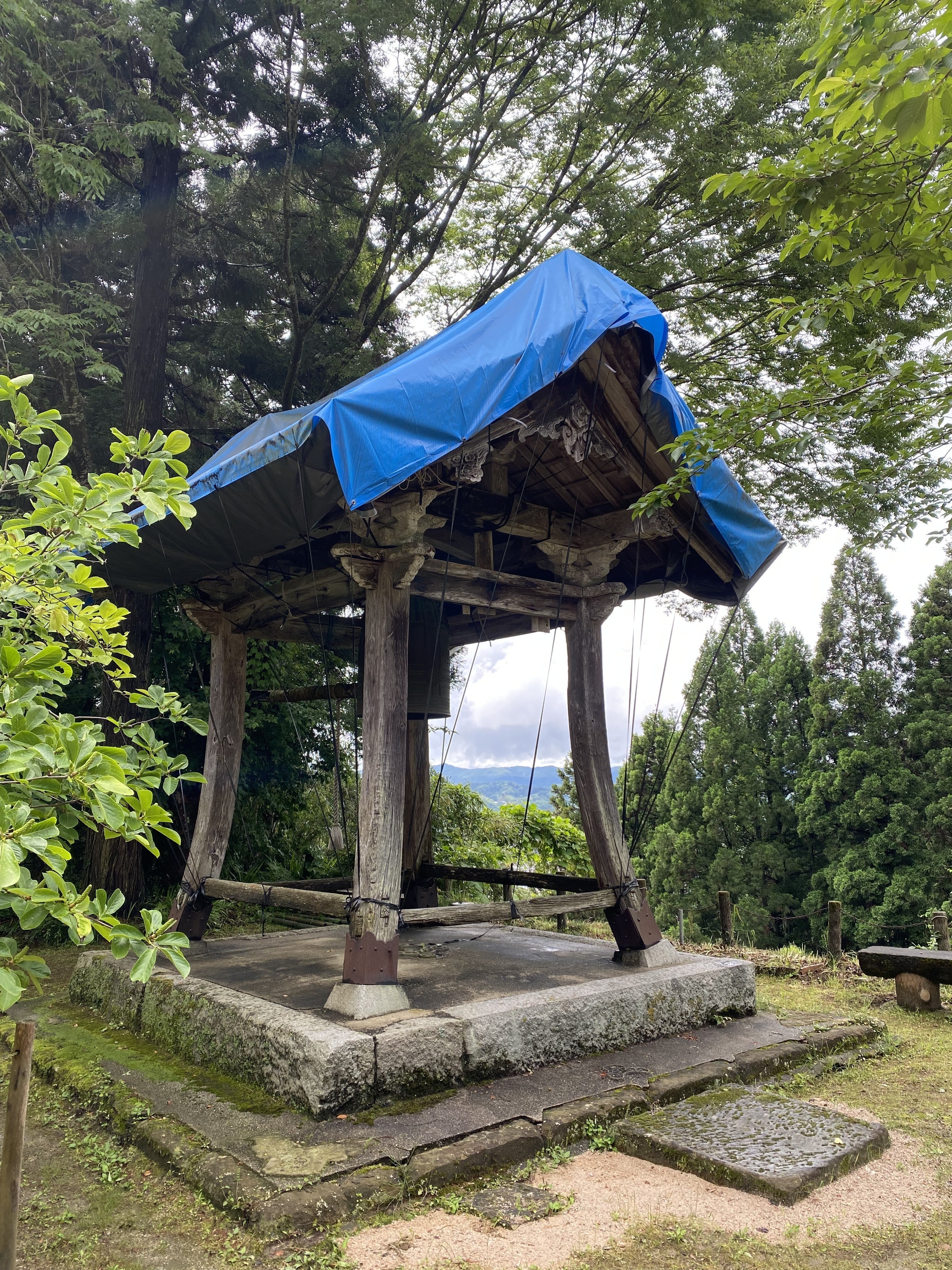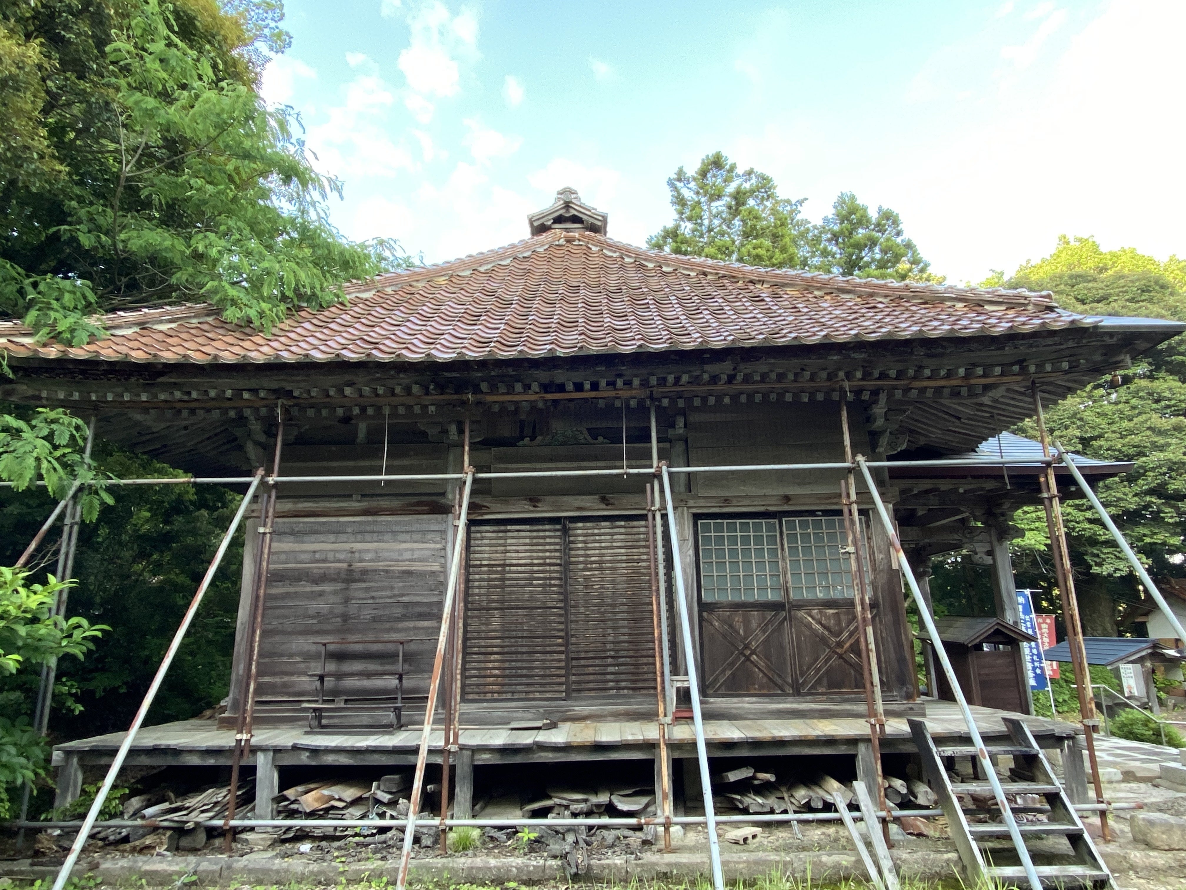 しかしながら、長年の風雨や湿気の多い山寺の環境に耐え続け、ここ数年で建物の損傷がひどくなりました。特に観音堂の軒は波打って今にも落ちそうになり、鐘楼堂は雨漏りがしていると同時に柱などの腐食も進んでおります。現在観音堂の一部は鉄骨で支えをしており、鐘楼堂にはブルーシートをかけて応急処置をとっております。これまでも何度か部分的な修繕をされてきた形跡はありますが、当時の木材をそのまま使用して建築当時の意匠性を残していくためには、観音堂は梁から上の部分解体修理、鐘楼堂は全解体修理が必要となりました。