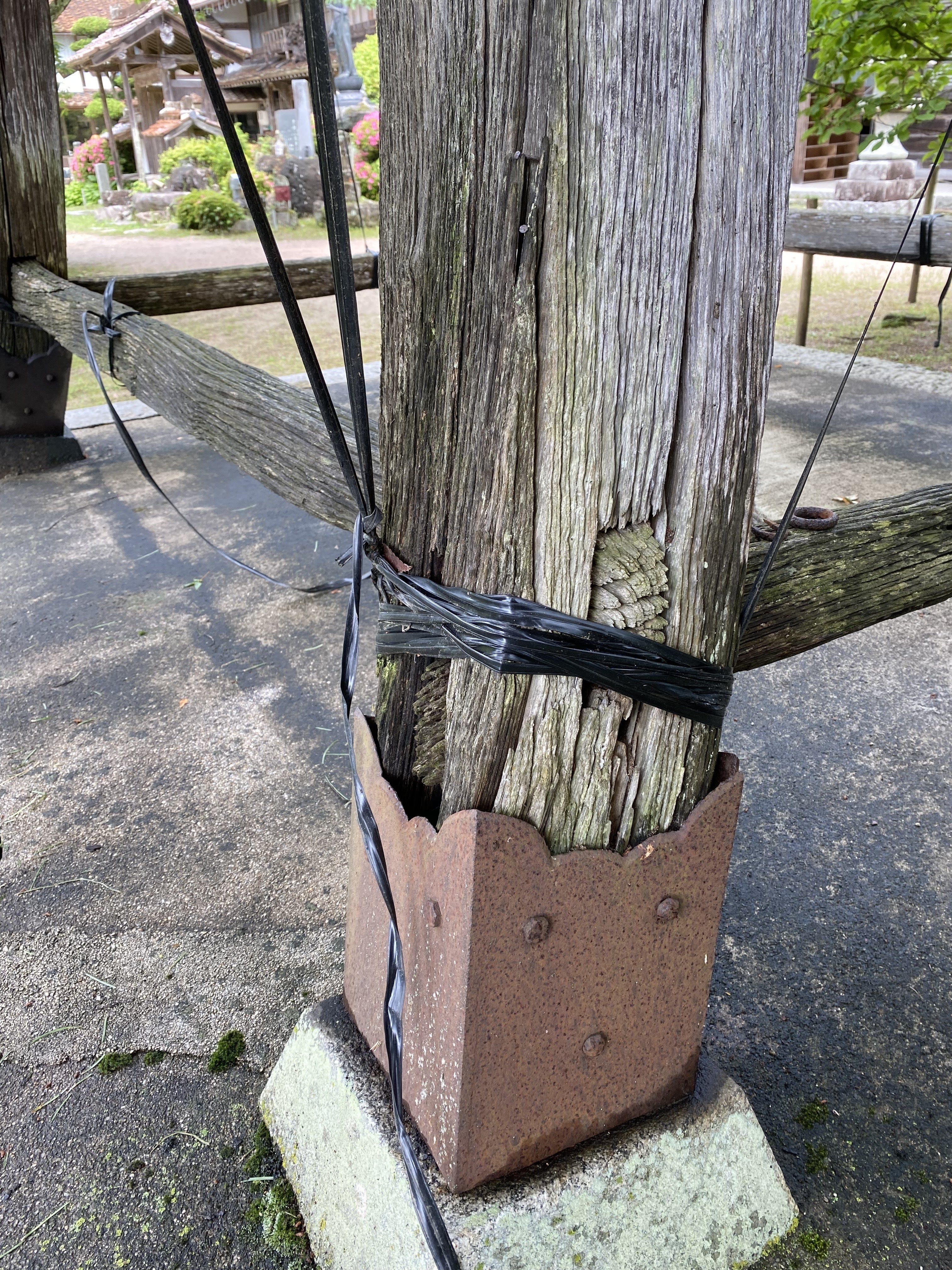 全ての建物に当時の松江藩主の名前が書かれており、建築当時の木材を使って意匠性を残す形でこれまで守られてきました。特に鐘楼堂の4本の柱は湾曲した自然木を使用してバランスを保たせる、当時の匠の技が残されており、大変珍しい建造物です。