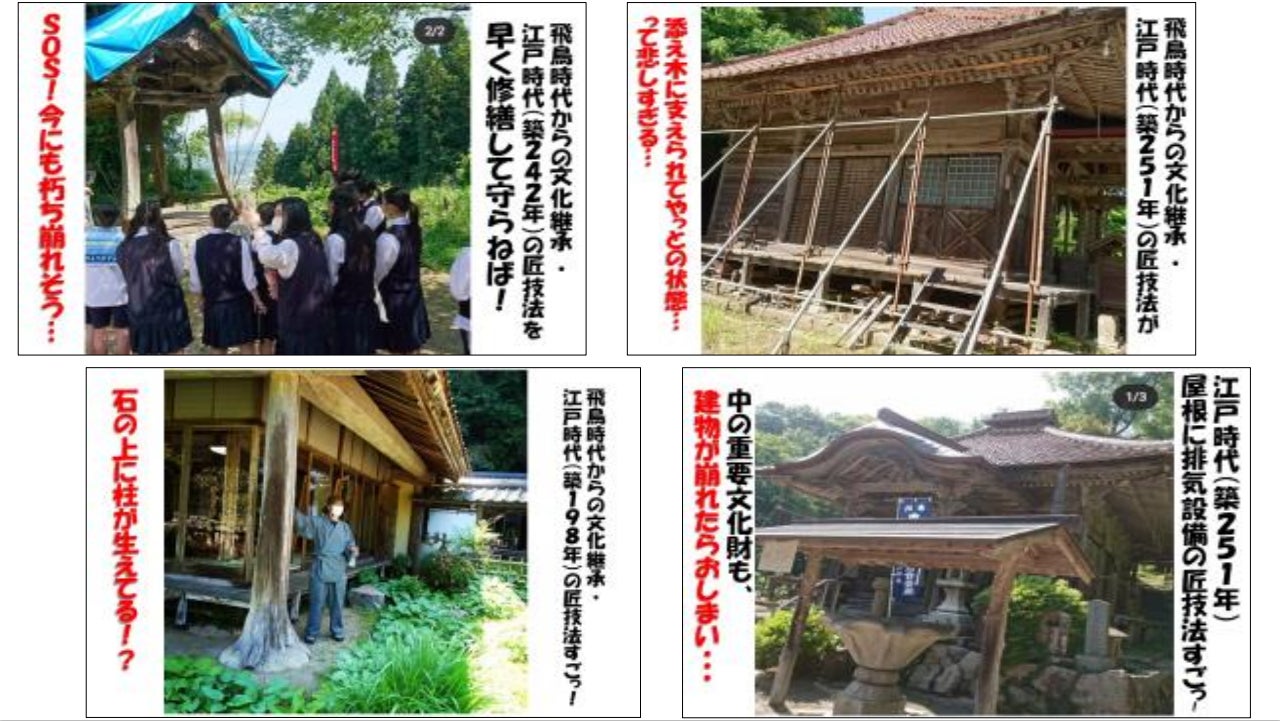 地元の三刀屋高校JRC(青少年赤十字)部の皆さんが、ブルーシートと添え木でやっと支えられた倒壊寸前の鐘楼堂や観音堂を見て驚かれ、居ても立っても居られない!と、クラウドファンディングで多数の方々から協力を募ることに背中を押してくれました。今回このクラウドファンディングを立ち上げるにあたって、十分なリターンをご用意できない中でも、高校生達が考えた手作りのものを用意していただきました。