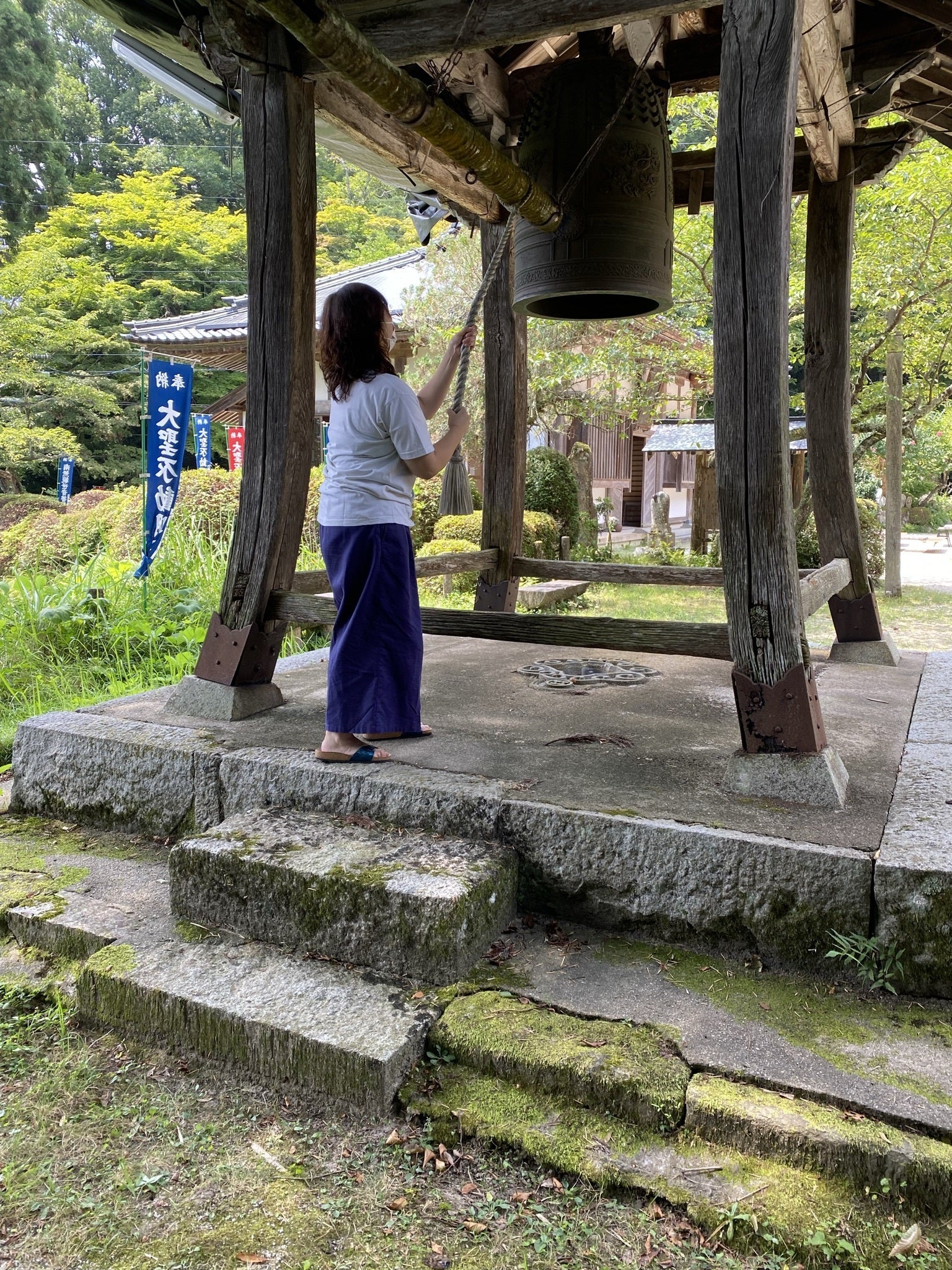 令和3年10月2日に開催された第45回全日本仏教徒会議島根大会の開催趣旨「世界平和を願う 」「仏の心を稽古する 」の実践の為、開催日までの毎月1日の正午より、賛同された県内仏教寺院で行われました。その後も峯寺では地元の方と共に祈りを続けるために毎月1日に行っておりましたが、令和5年5月のある日、鐘を撞く撞木を支える金具が落ちたために、中断しております。早期に修繕してまた祈りを続けたいと思います。