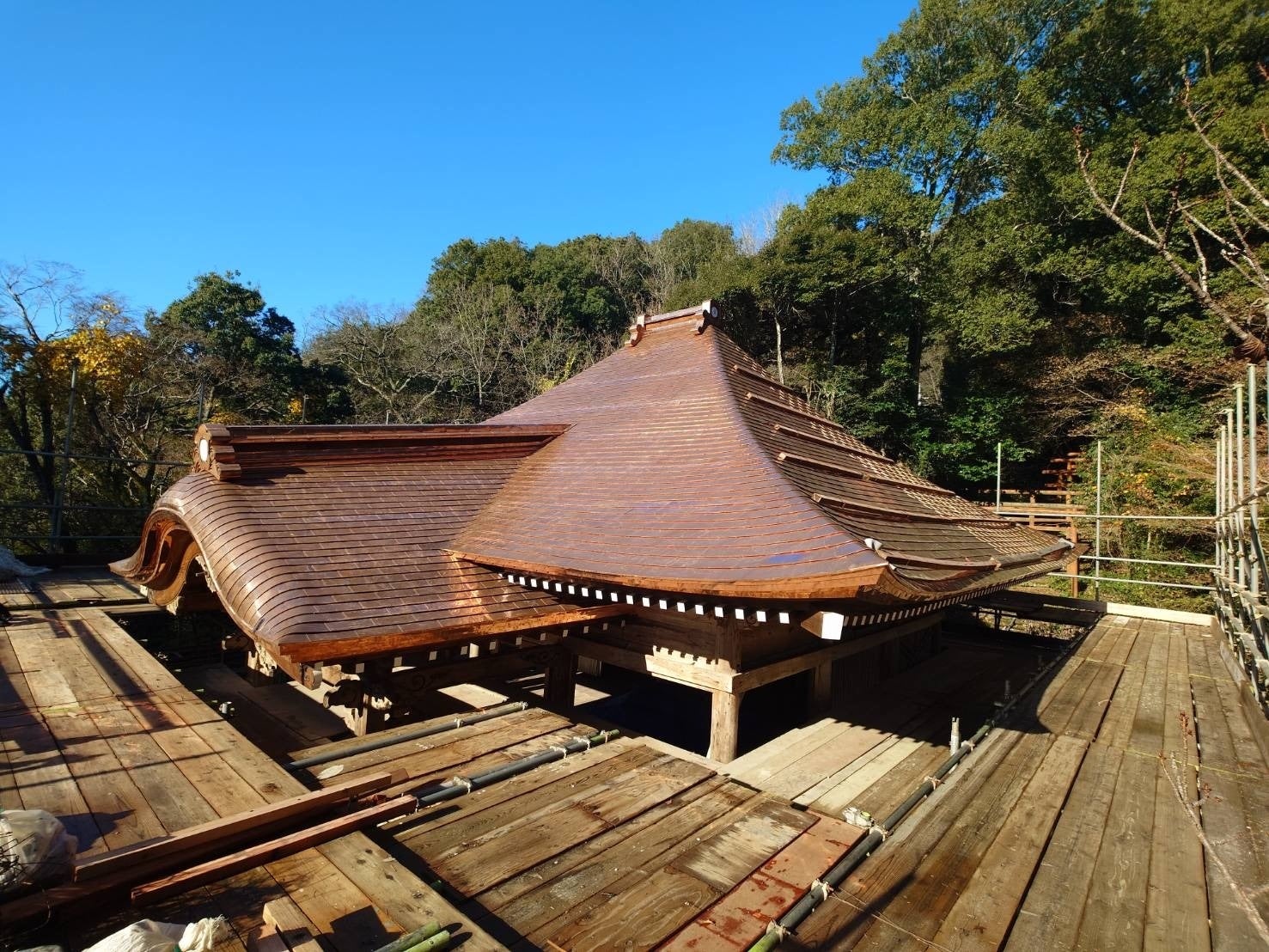 2025/12/28 06:33銅板葺き工事完了の屋根状況です。 仮足場撤去前のこの角度姿はこの時にしか撮れませんし、一部銅板葺きのための足場板が一部残っていますが、これも施工姿を想像する手掛かりと思って頂けたら幸いです。まだ少し仮設材が残り、建具などが入っていませんが、最後の細部工事が進められているためです。向拝部屋根周りの姿です。下地工事の宮大工の仕事と銅板葺きの技量があってのこの姿です。曲線がきれだと思いませんか?新旧の材料が一体的になり、細工も当一致感があり、「いい仕事してますね~!」 宮大工はじめ各作業の職人さん、工事関係者に敬意を表します。 もっと見る