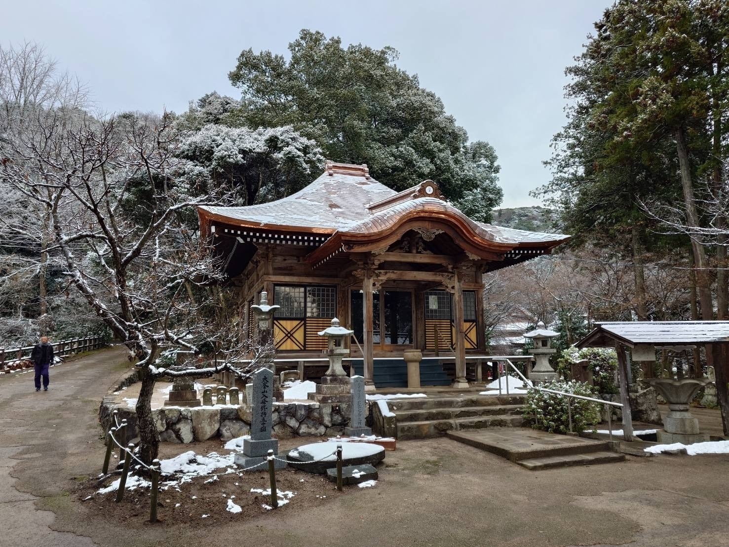 2026/01/17 22:00ご協力いただいた皆様に、工事完了の報告をさせて頂きます。本当に有難うございました。クラウドファンディングにご寄付を頂いた皆様をはじめ多くの方々からのご協力や、施工関係の「より良きお堂に!」との気持ちをもって日々の努力を頂きました。さらに、確かな技術のもとケガ人もなく無事完了しました。少し雪のある姿ですが、それも風景の一つと観て頂けたらと思います。 機会ありましたら、是非現地でご覧いただけたら幸いです。また、完成により、亡くなられた第44世快遍僧正の遺志である「次世代へと繋ぐ」ことが果たせると信じております。(Y.K.) 完成直前の銅板葺きの鬼瓦も板金職人の腕前による銅板加工です。新しい銅板なので光っていますが、銅特有の「緑青」という錆で徐々に燻みますが、その錆の効果で数百年でも銅板は維持できます。 もっと見る改修状況 2025年12月中旬 完成直前状況