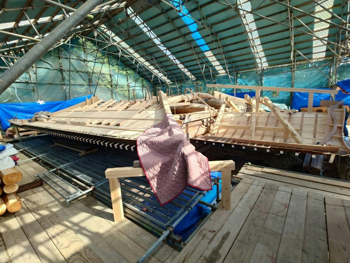 2025/10/16 22:00上記の様子は10月上旬ですが、本棟の軒先が形成され、向拝部屋根の形状が少し見えてきました。今後の本棟の小屋組み(屋根の構造組)が期待されます。軒先の下地が組まれています。現場合わせの慎重な作業が行われている様子が分かり、職人さんの手仕事に期待がより高まります。細い材(垂木)が軒先に向けて伸びているのが見えますが、長い材と短い材があり、長い材が力を受け持つ材で短い材は化粧材です。建築中だから構成がわかる写真です。この垂木の間から少しだけ下側の垂木が見える(先端が白い材)のが分かると思いますが、下の垂木が「地垂木」上が「飛燕垂木」で、2段構成で仕上がります。中旬に入り、正面から見て右奥側の様子です。屋根の四隅は、少し勾配で登っているのが分かります。神社仏閣建築ではよく見る様子ですが、反りのある材料を組んでおり、材の加工と癖を読んでの材料組は伝統建築ではならでしょうか。 一番上になって並んでいるのは「桔木(ハネギ)」と呼ばれる材ですが、扇状に並べられています。 さて、どんな屋根形状になるでしょう・・・・・お楽しみに!向拝部の屋根組ですが、曲線が多く職人さんの技量が重要になります。今回の工事では「宮大工」が経験を活かしての仕事から、完成の折には美しい姿が現れることでしょう。 もっと見る